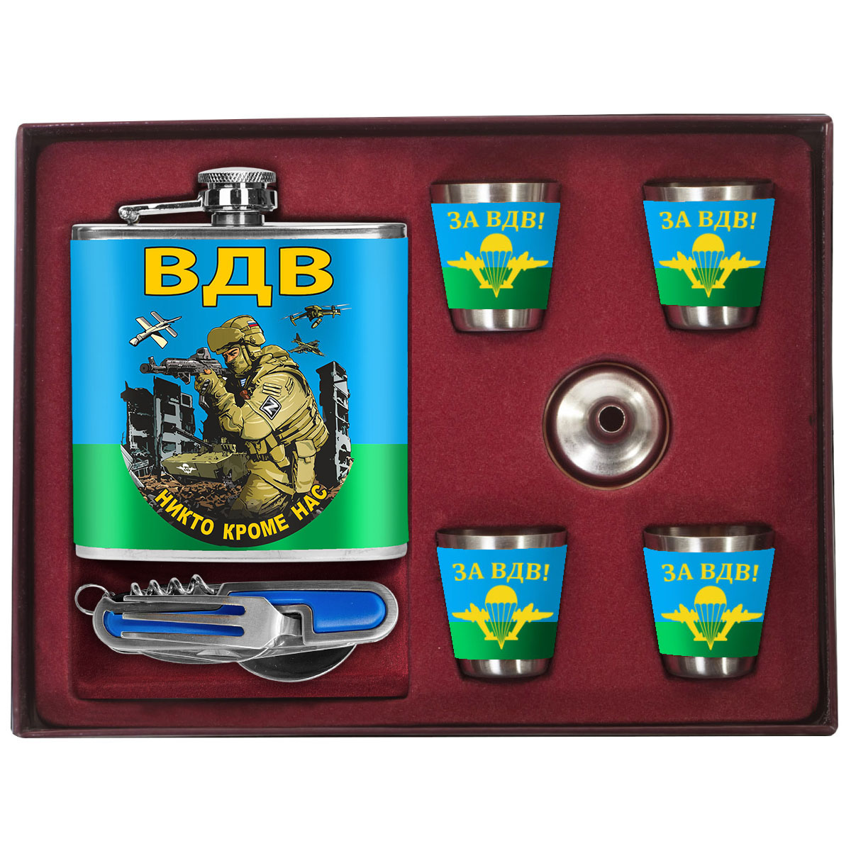 У нас представлен каталог из нескольких тысяч товаров и сувениров с символикой ВДВ и вы гарантированно найдете то, что отлично подойдет в подарок для папы, мужа, любимого парня или сына на день ВДВ.