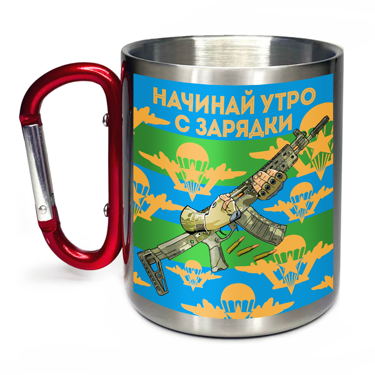 Большая кружка с карабином ВДВ "Начинай утро с зарядки" с виниловой наклейкой
