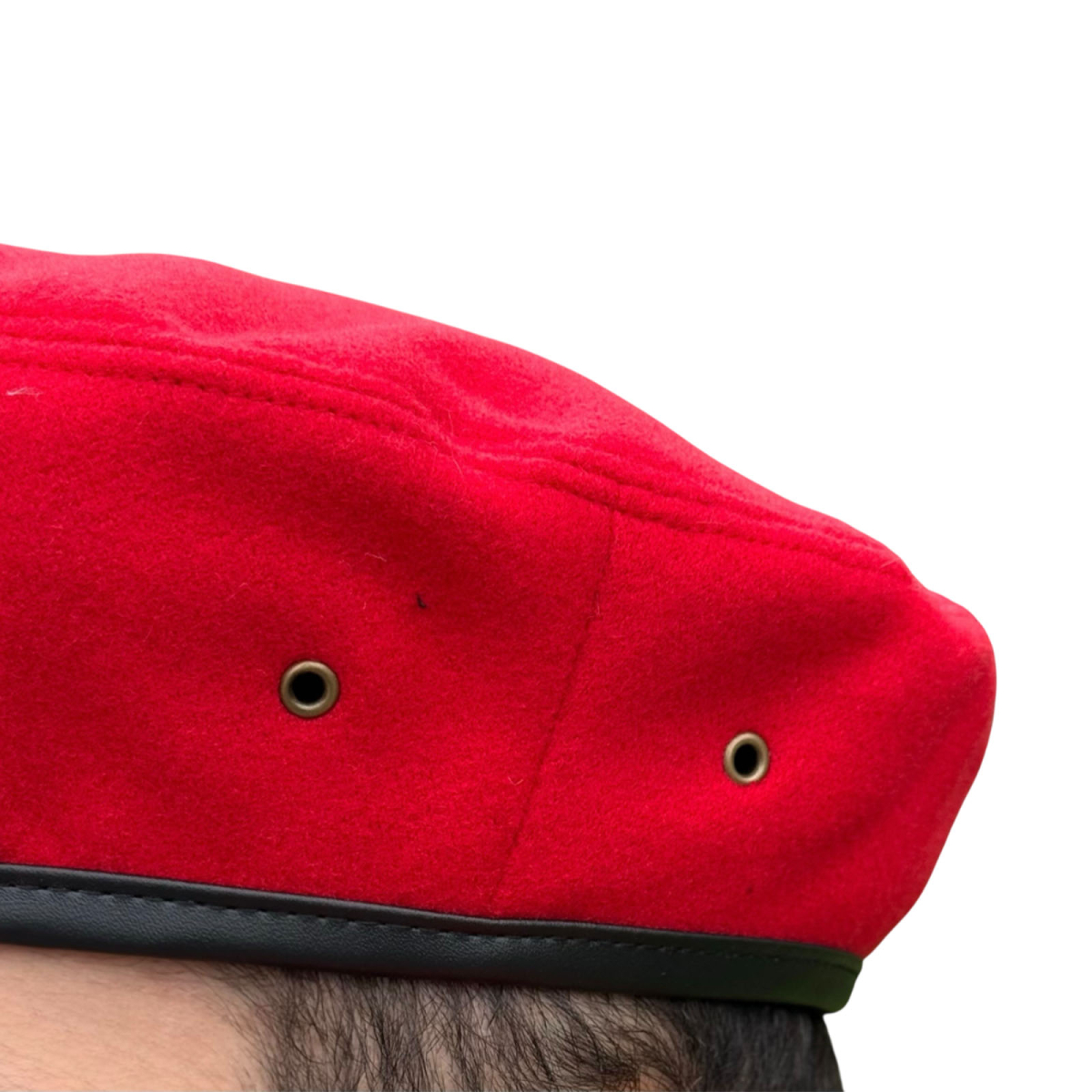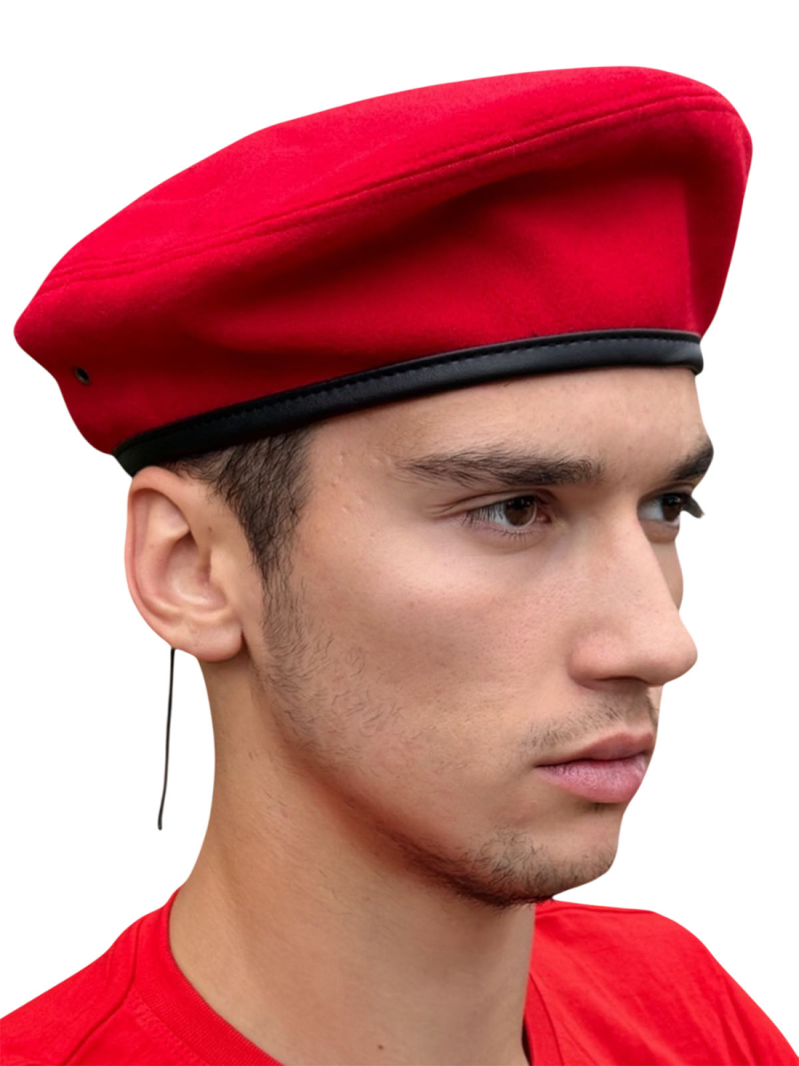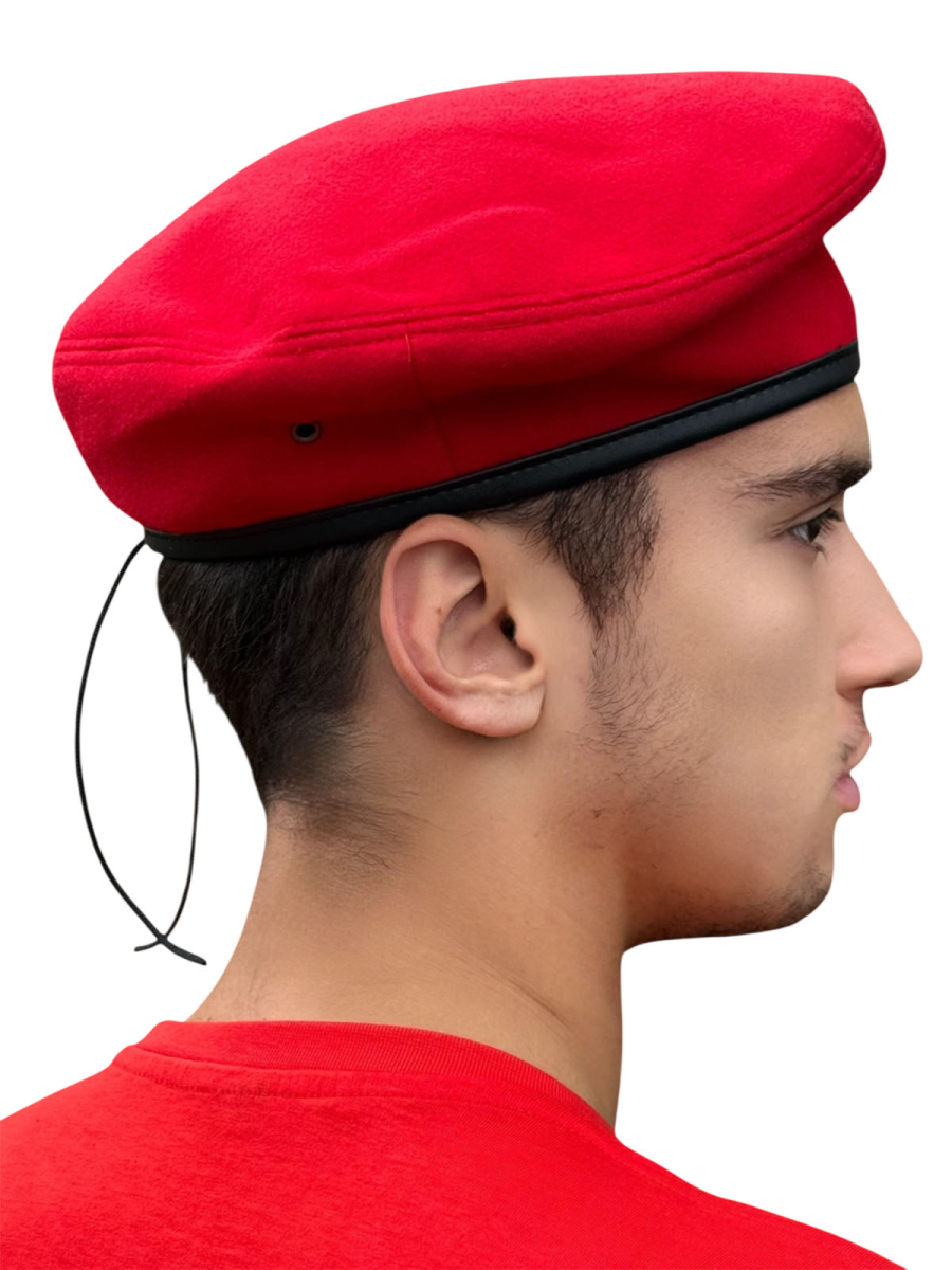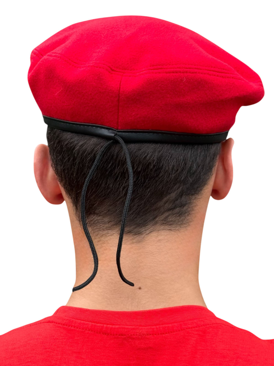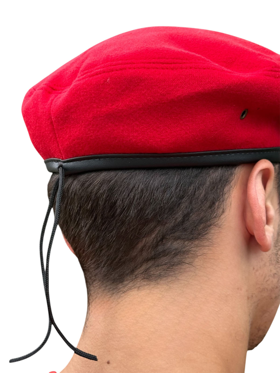 Шовный берет красного цвета, из мягкого фетра, не отбит. Предусмотрены люверсы для вентиляции, по нижнему краю размещена кожаная окантовка с регулировочным шнуром, подкладка – из дышащей тафетты. Не отбит, уголки, кокарды и пр. прикрепляются самостоятельно.