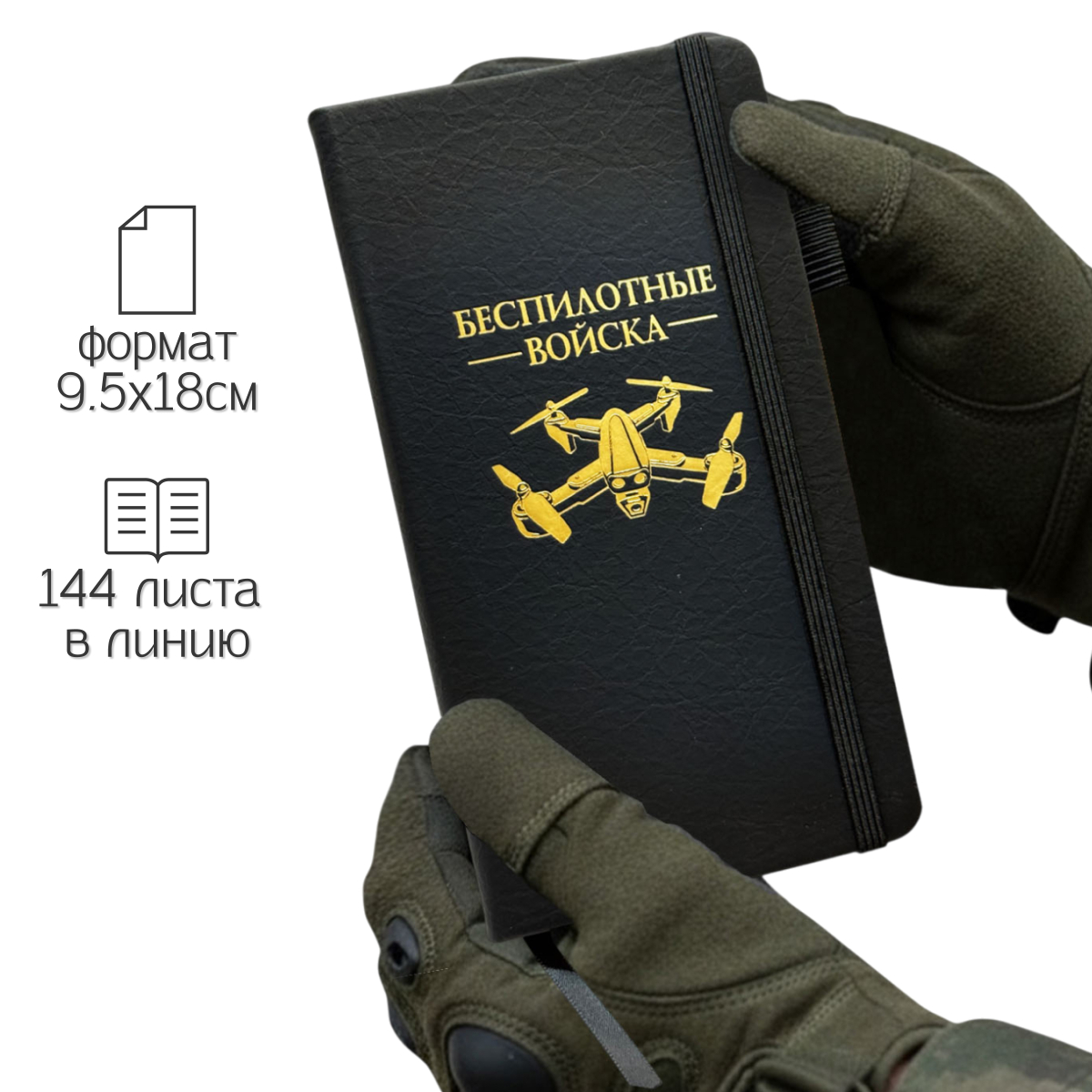 Компактный блокнот "Беспилотные войска" в размере 9.5х18 см практичный и презентабельный, он одинаково уместен в деловой сумке, полевой куртке или на рабочем столе. Жёсткая обложка с золотистым принтом не только защищает внутренний блок, но и придаёт изделию солидный, аккуратный вид.