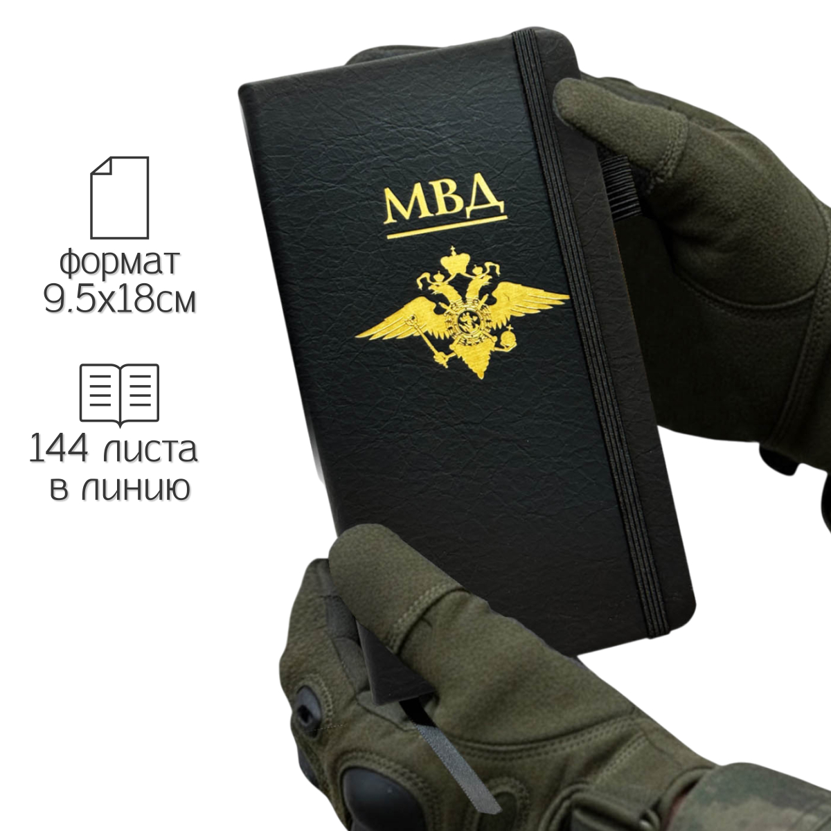 Компактный блокнот МВД в размере 9.5х18 см практичный и презентабельный, он одинаково уместен в деловой сумке, полевой куртке или на рабочем столе. Жёсткая обложка с золотистым принтом не только защищает внутренний блок, но и придаёт изделию солидный, аккуратный вид.