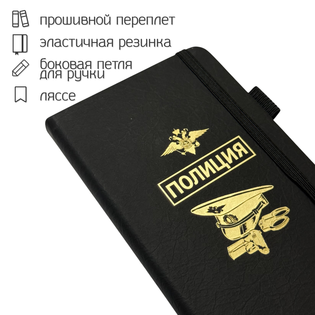 Компактный блокнот "Полиция" в размере 9.5х18 см практичный и презентабельный, он одинаково уместен в деловой сумке, полевой куртке или на рабочем столе. Жёсткая обложка с золотистым принтом не только защищает внутренний блок, но и придаёт изделию солидный, аккуратный вид.