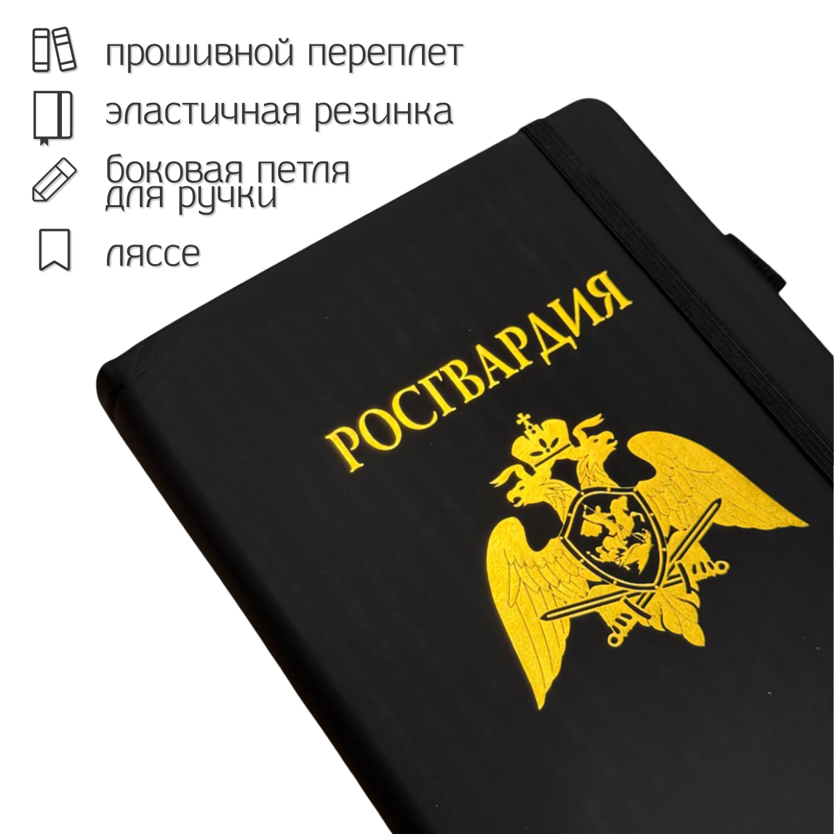 Черный блокнот "Росгвардия" в размере 14.5х21.5 см практичный и презентабельный для повседневных задач. Жёсткая обложка с золотистым принтом не только защищает внутренний блок, но и придаёт изделию солидный, аккуратный вид.