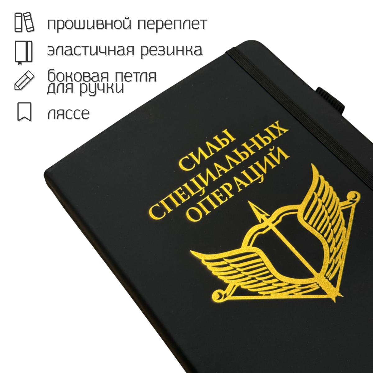 Черный блокнот "Силы специальных операций" в размере 14.5х21.5 см практичный и презентабельный для повседневных задач. Жёсткая обложка с золотистым принтом не только защищает внутренний блок, но и придаёт изделию солидный, аккуратный вид.