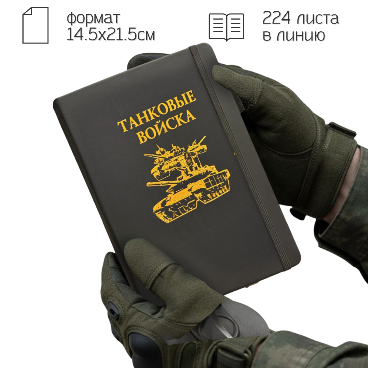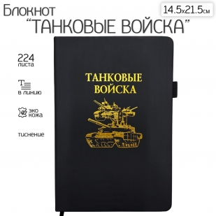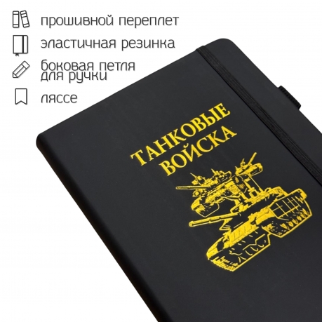 Черный блокнот "Танковые войска" в размере 14.5х21.5 см практичный и презентабельный для повседневных задач. Жёсткая обложка с золотистым принтом не только защищает внутренний блок, но и придаёт изделию солидный, аккуратный вид.