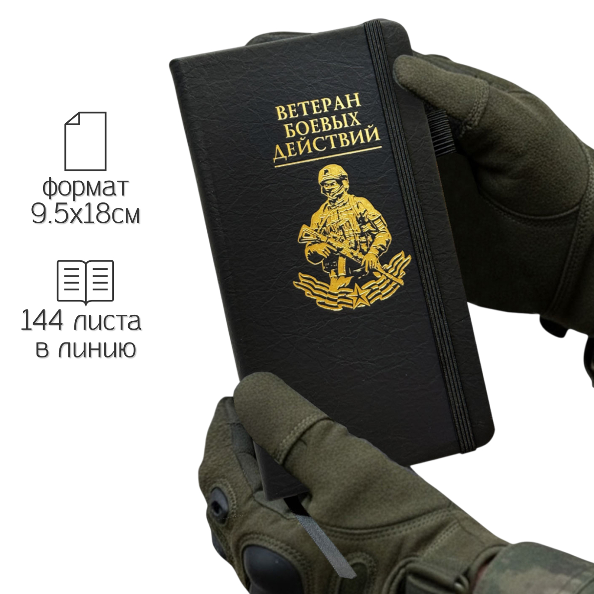 Компактный блокнот "Ветеран боевых действий" в размере 9.5х18 см практичный и презентабельный, он одинаково уместен в деловой сумке, полевой куртке или на рабочем столе. Жёсткая обложка с золотистым принтом не только защищает внутренний блок, но и придаёт изделию солидный, аккуратный вид.