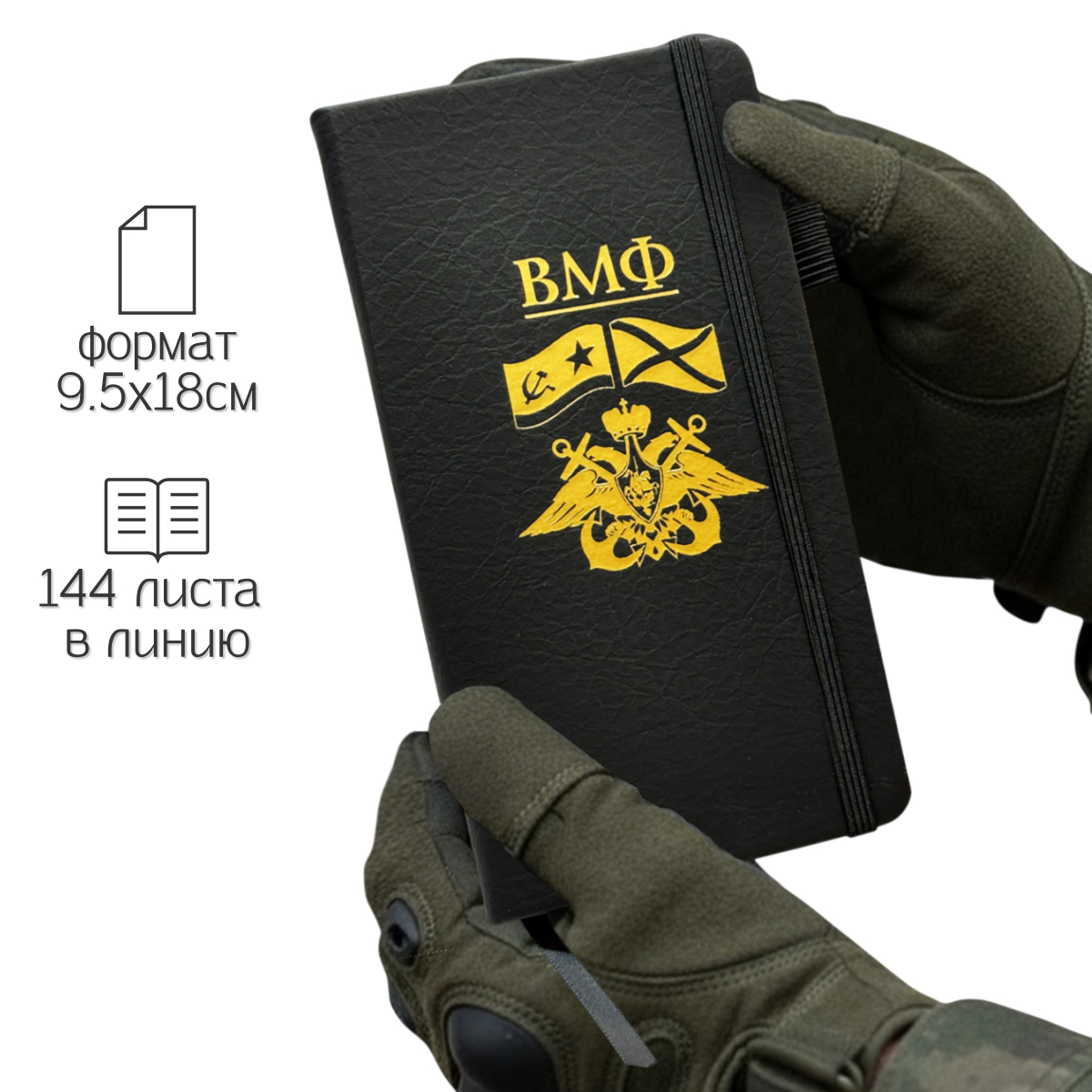 Компактный блокнот ВМФ в размере 9.5х18 см практичный и презентабельный, он одинаково уместен в деловой сумке, полевой куртке или на рабочем столе. Жёсткая обложка с золотистым принтом не только защищает внутренний блок, но и придаёт изделию солидный, аккуратный вид.