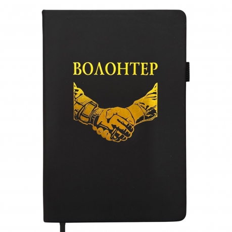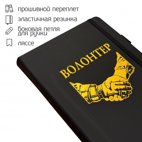 Черный блокнот "Волонтер" в размере 14.5х21.5 см практичный и презентабельный для повседневных задач. Жёсткая обложка с золотистым принтом не только защищает внутренний блок, но и придаёт изделию солидный, аккуратный вид.