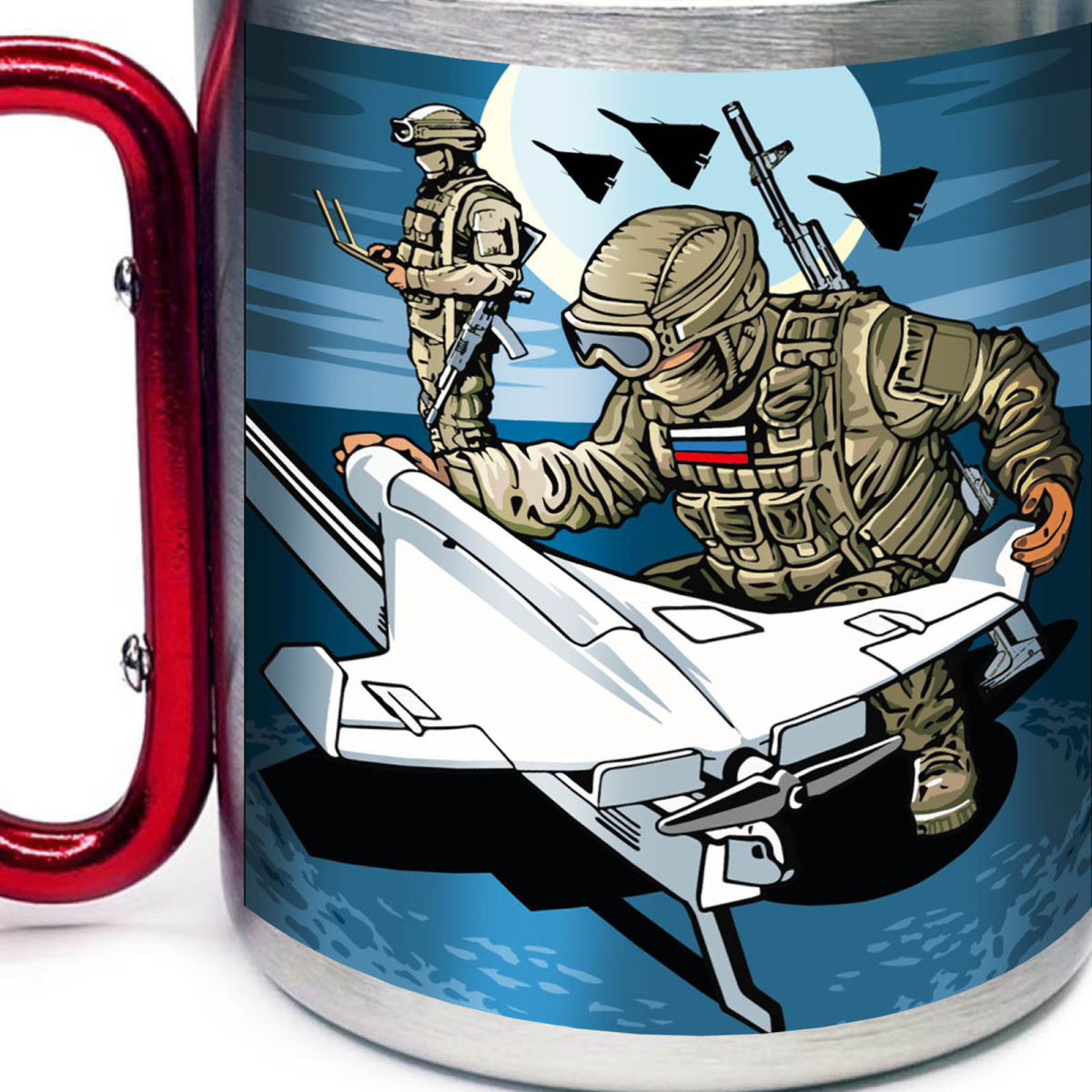 Купить кружку "Дронармия" с ручкой карабином можно в Военпро, с удобной доставкой по всей РФ.