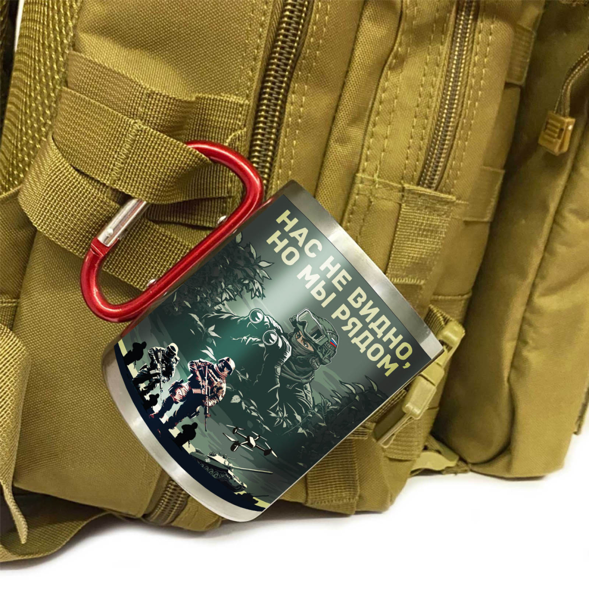 Купить кружку "Нас не видно, но мы рядом" с ручкой карабином можно в Военпро, с удобной доставкой по всей РФ.