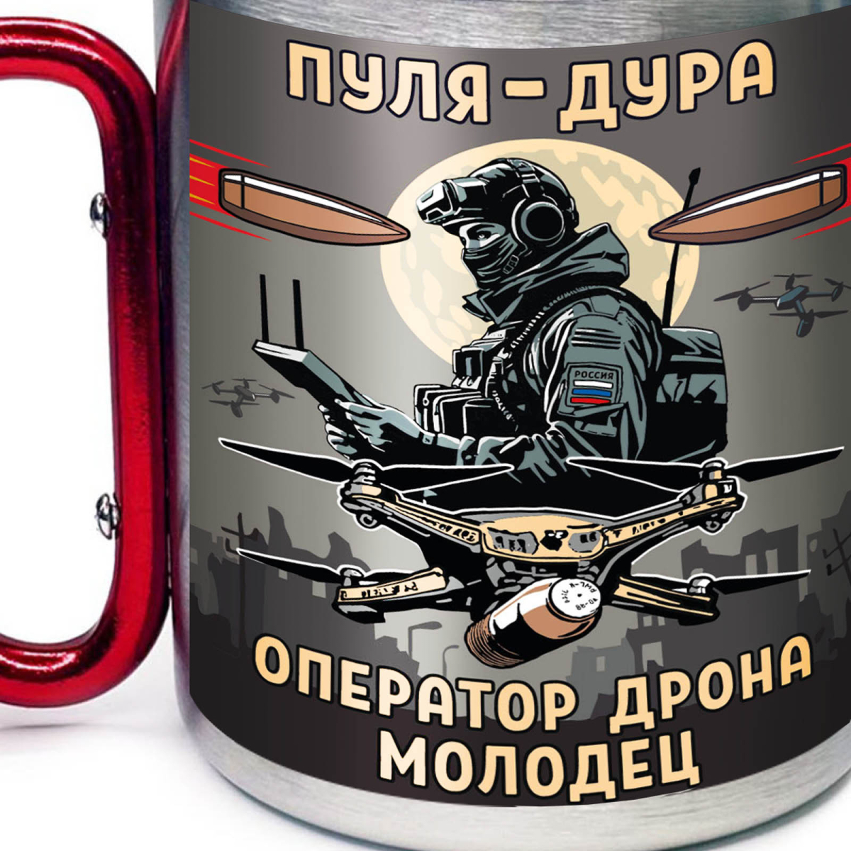 Купить кружку "Пуля – дура, оператор дрона – молодец" с ручкой карабином можно в Военпро, с удобной доставкой по всей РФ.