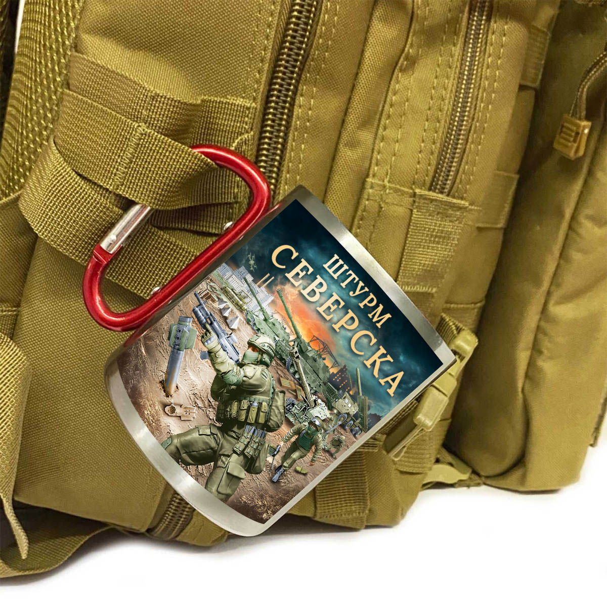 Купить кружку "Штурм Северска" с ручкой карабином можно в Военпро, с удобной доставкой по всей РФ.
