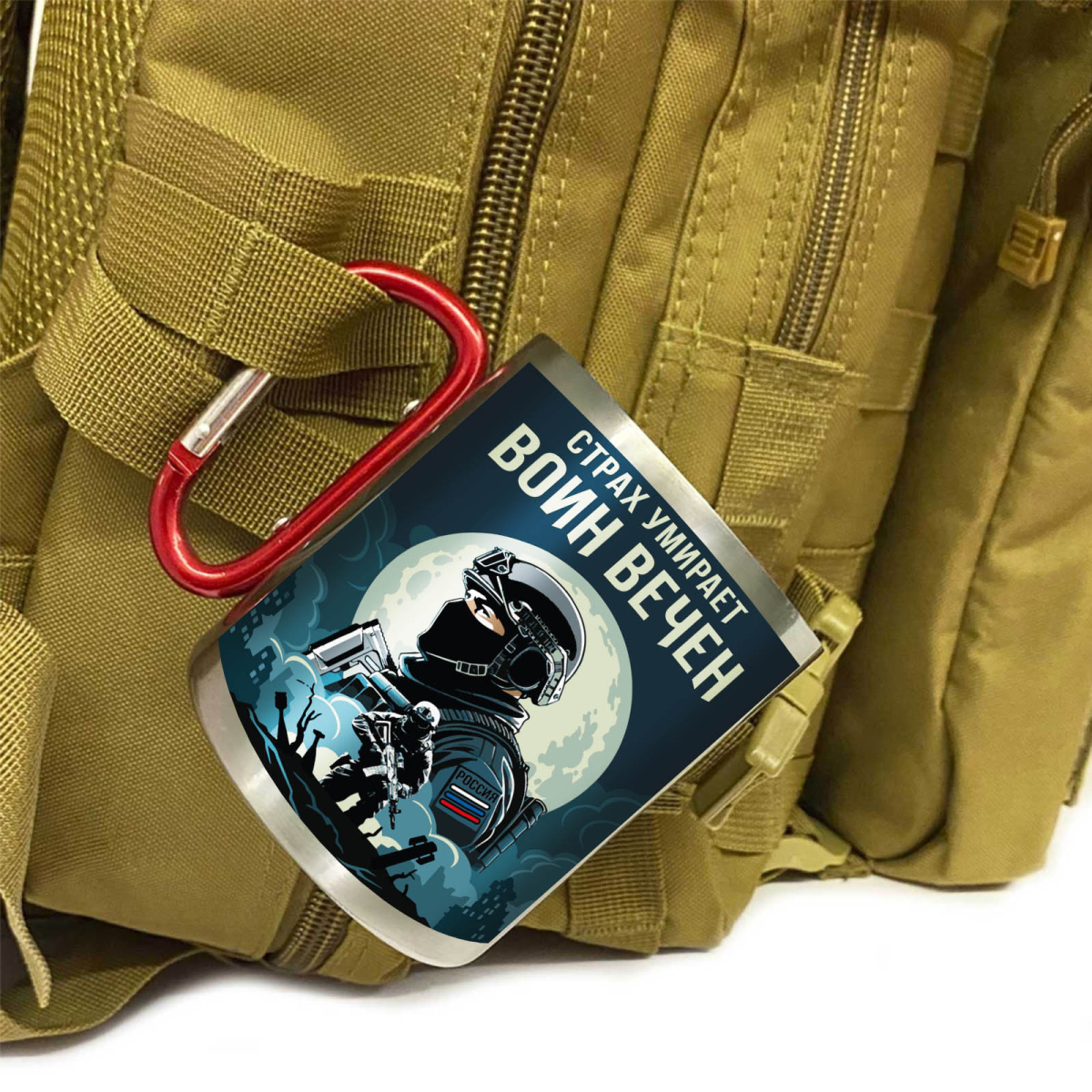 Купить кружку "Страх умирает – Воин вечен" с ручкой карабином можно в Военпро, с удобной доставкой по всей РФ.
