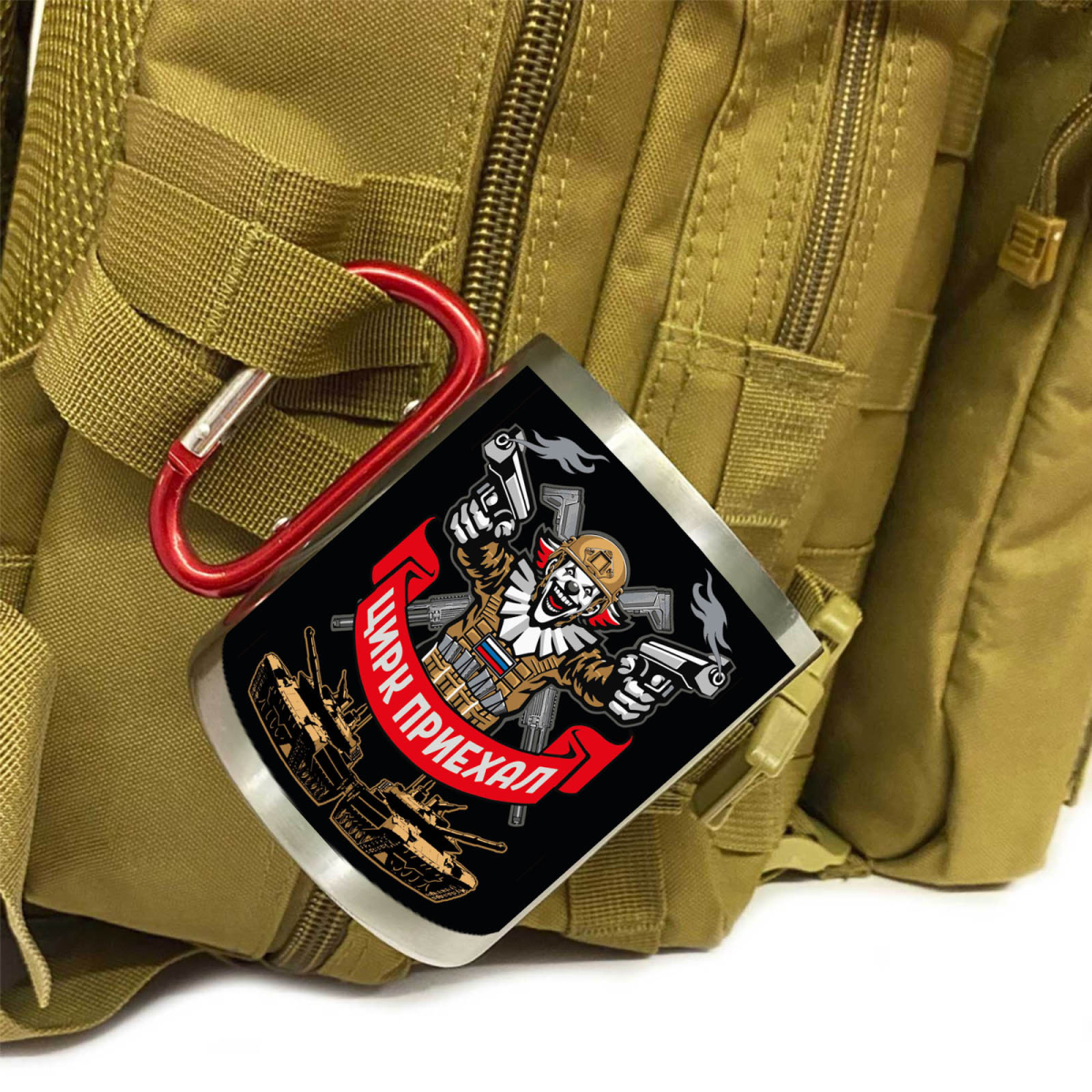 Купить кружку "Цирк приехал" с ручкой карабином можно в Военпро, с удобной доставкой по всей РФ.