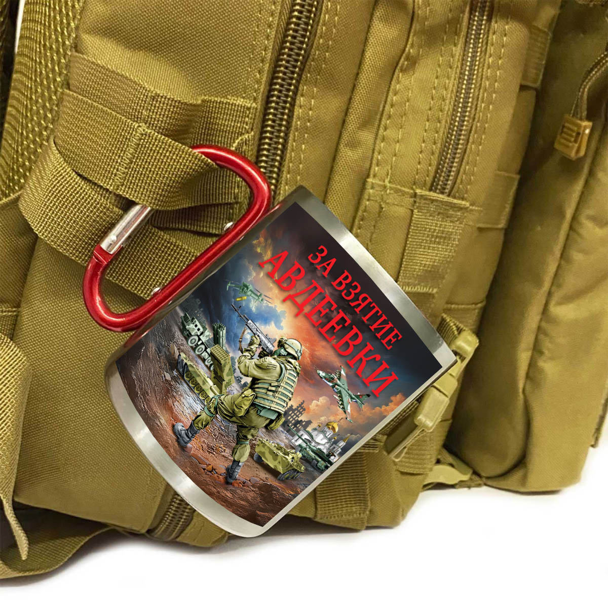 Купить кружку "За взятие Авдеевки" с ручкой карабином можно в Военпро, с удобной доставкой по всей РФ.