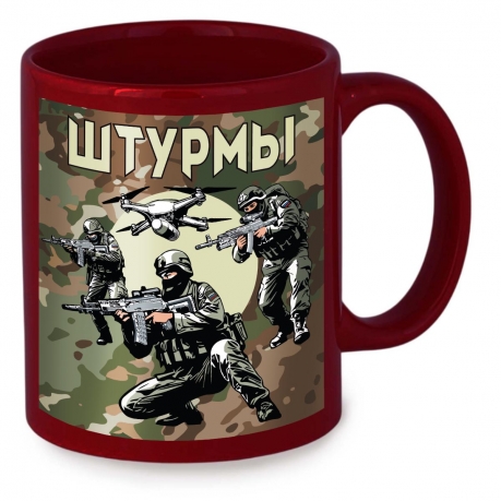 Бордовая керамическая кружка "Штурмы" с камуфляжной виниловой наклейкой