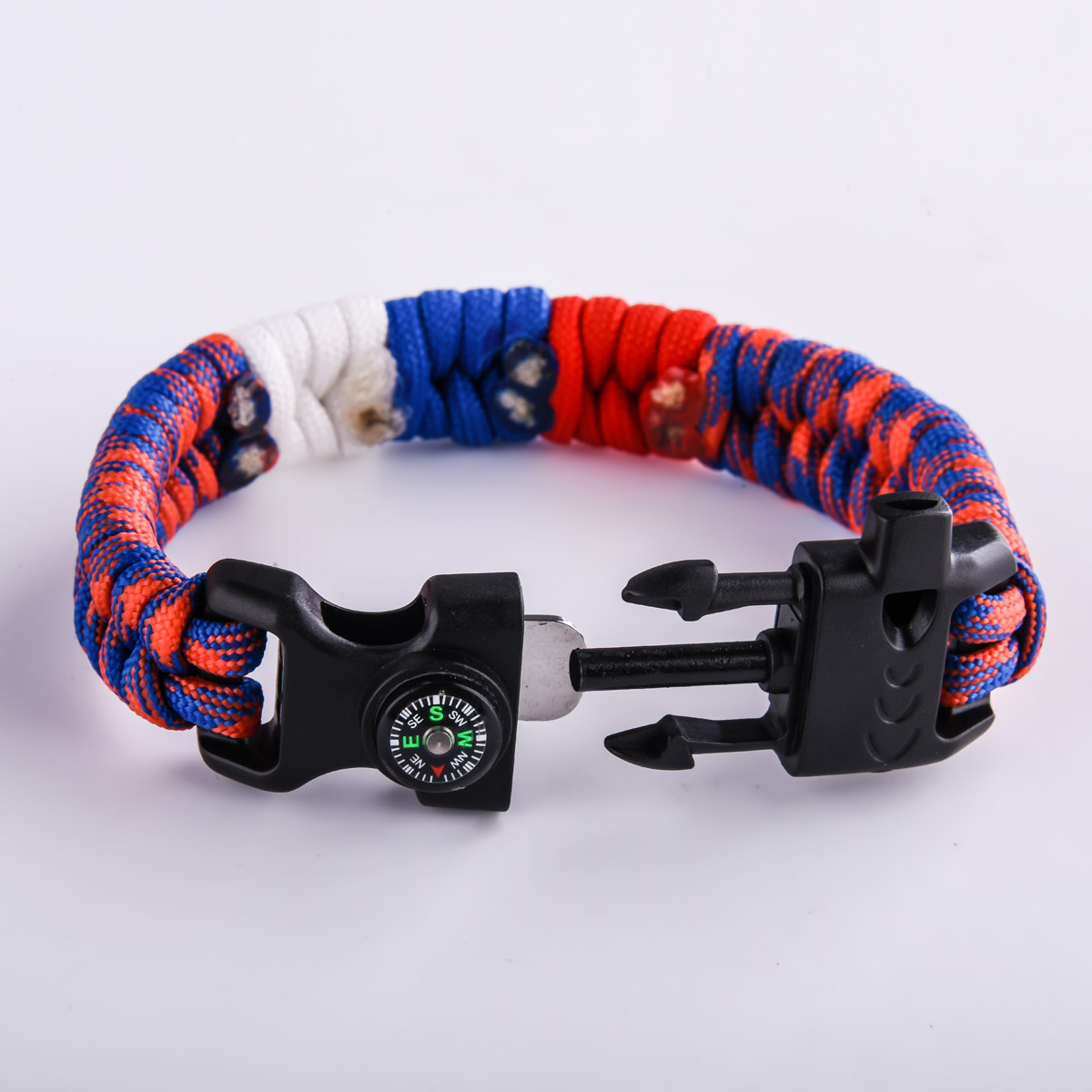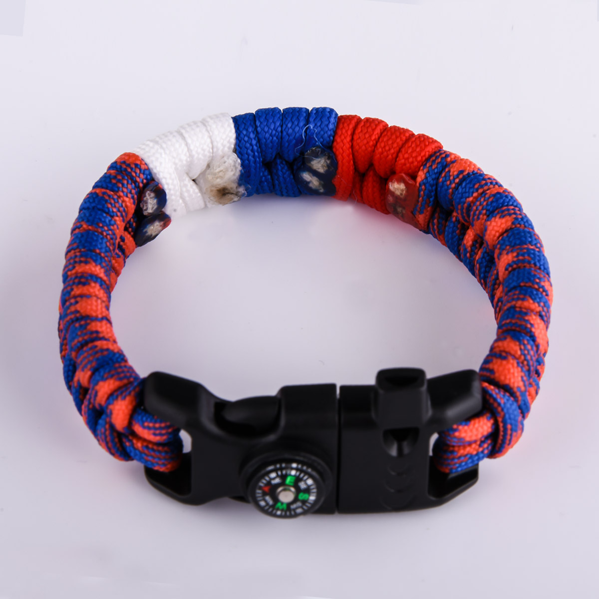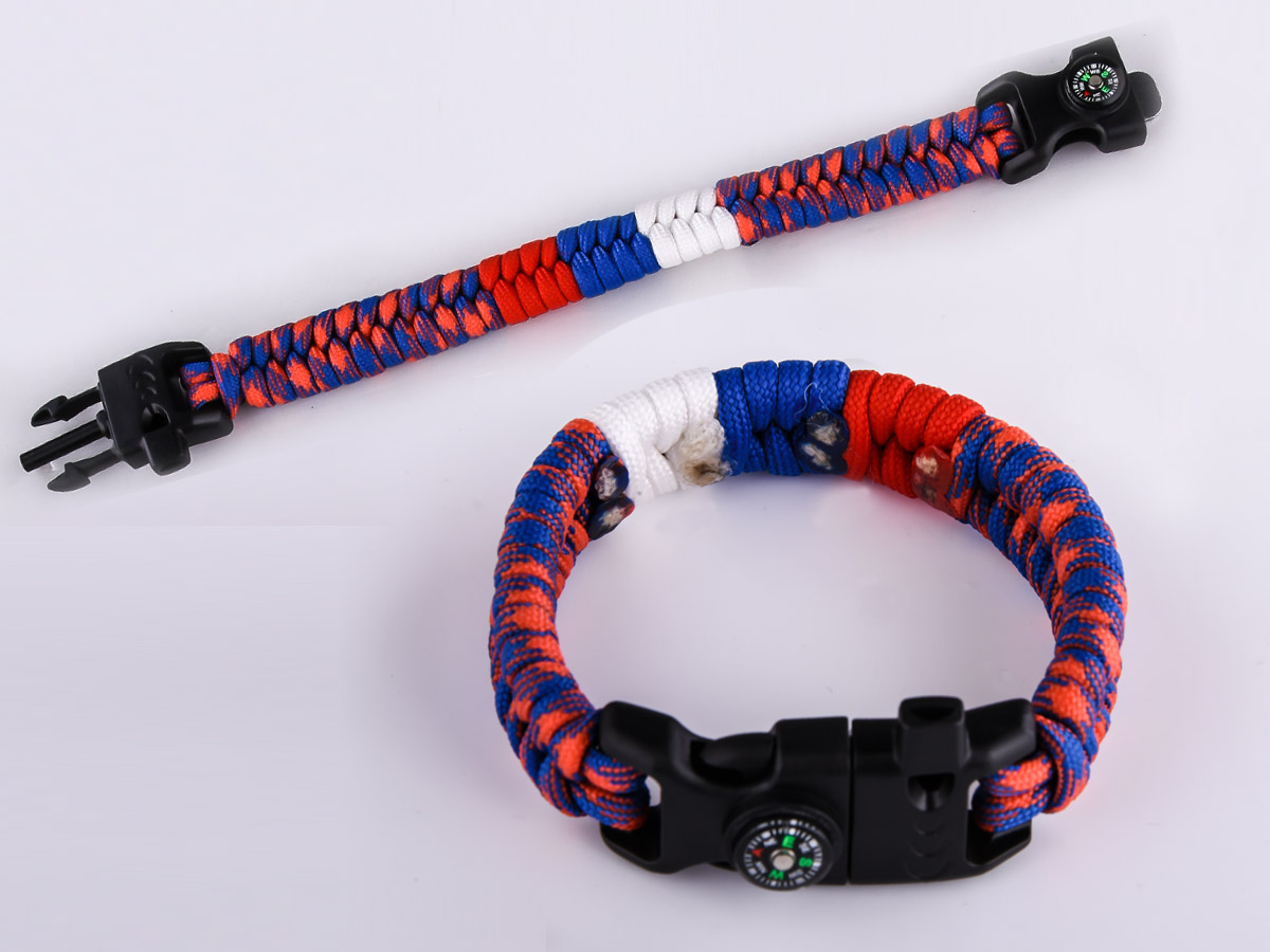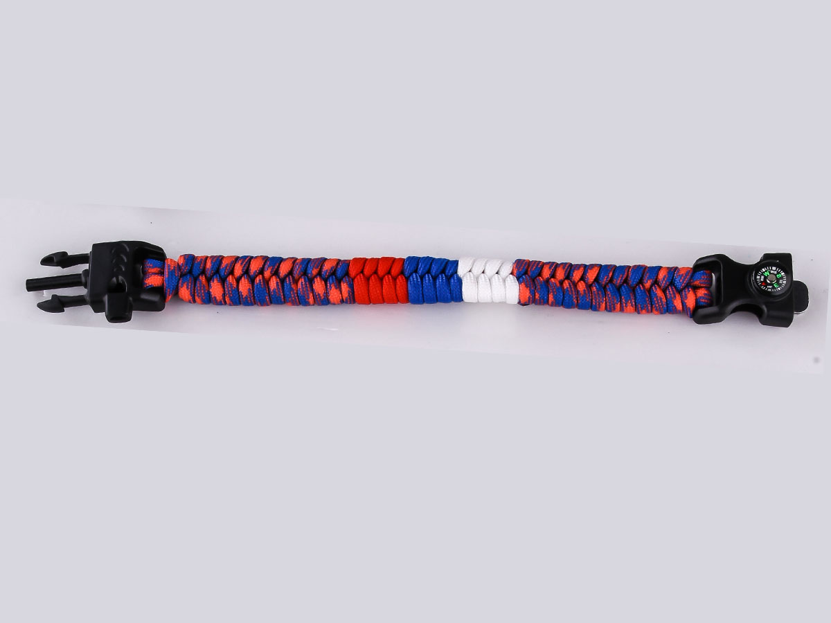Плетеный браслет из паракорда по схеме рыбий хвост посередине с триколором застегивается с помощью черной пряжки. В пряжку встроен компас, свисток и надежное огниво.