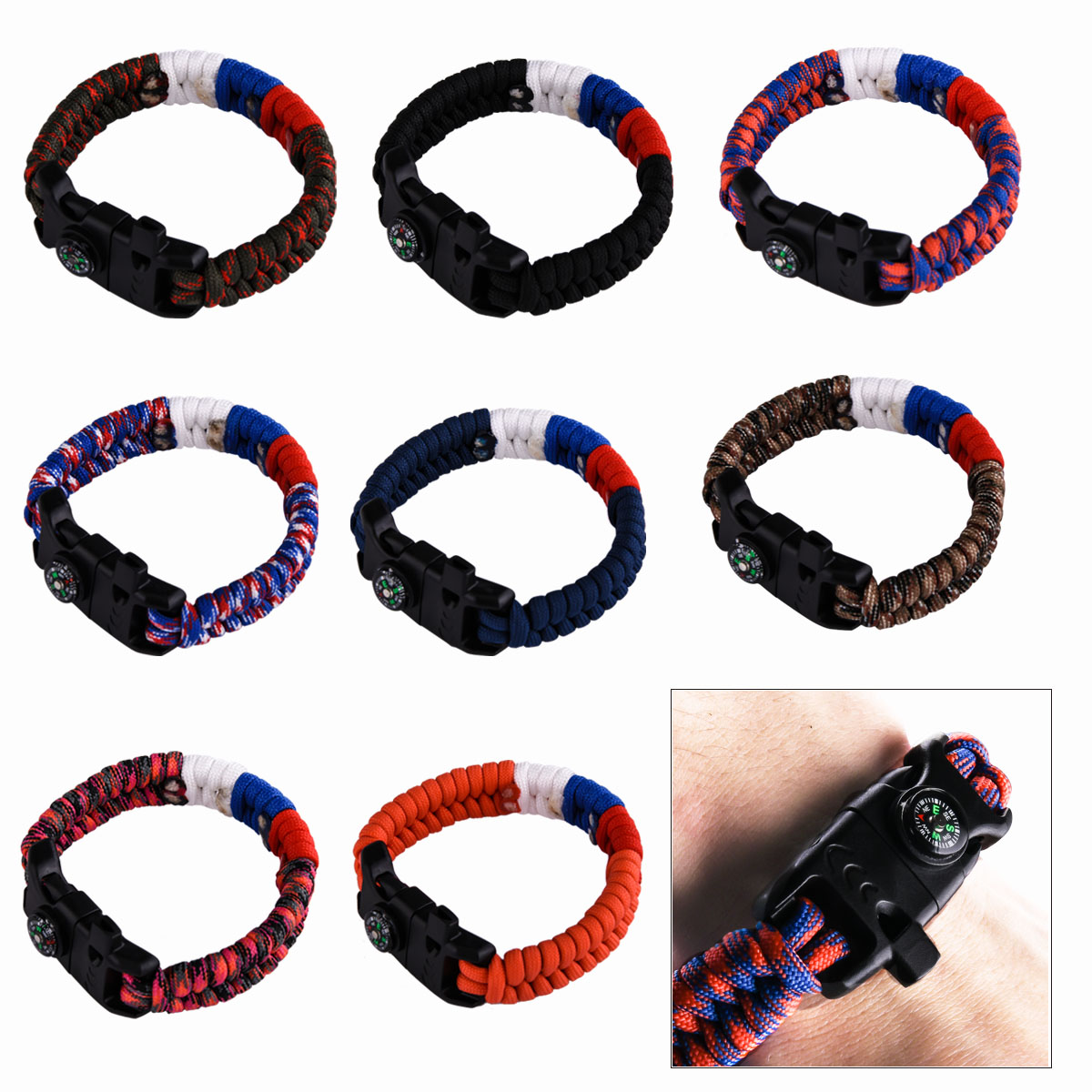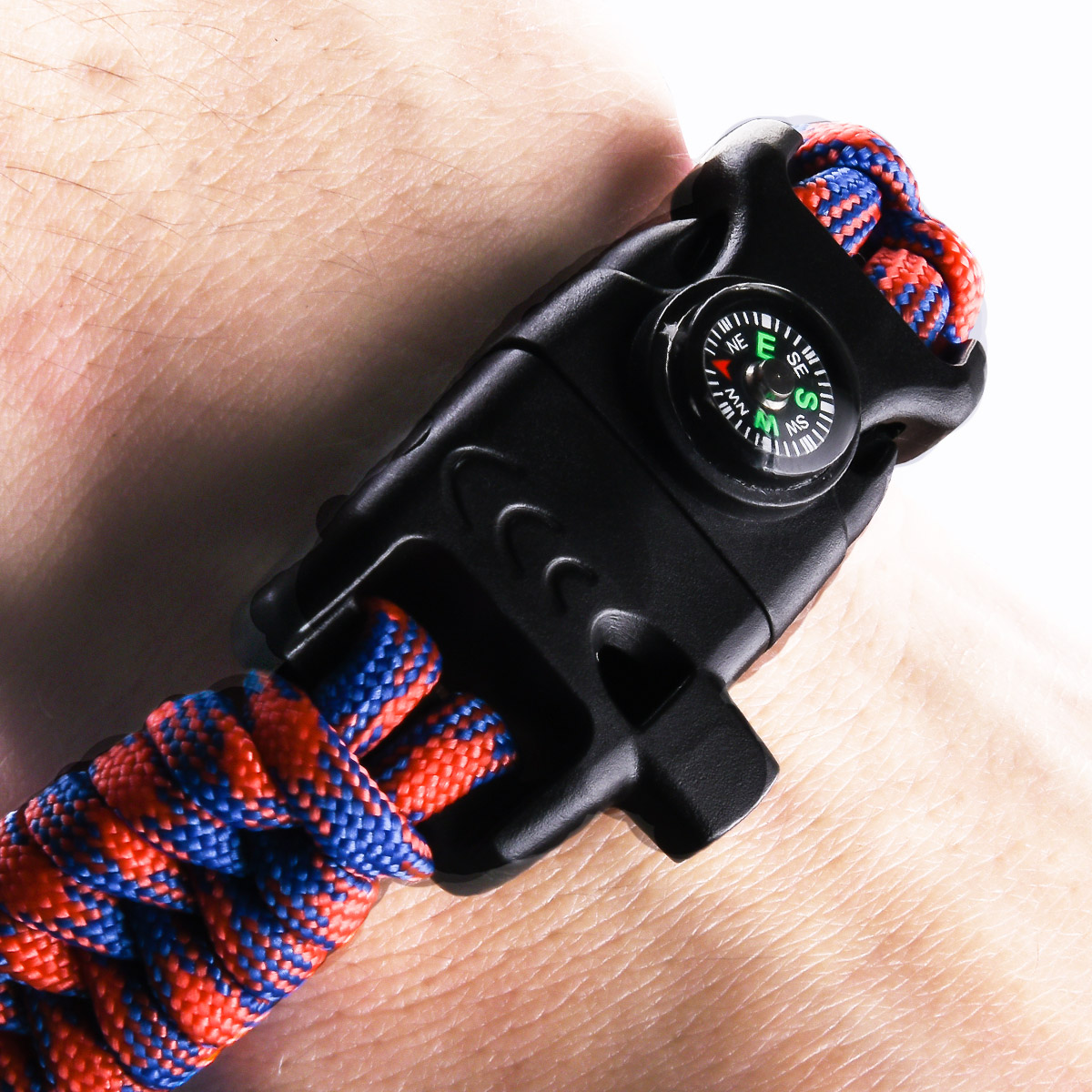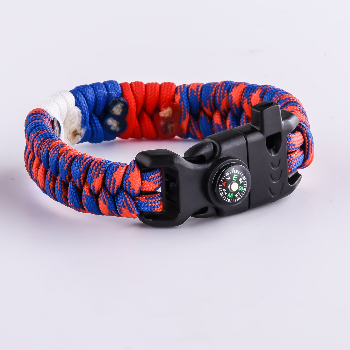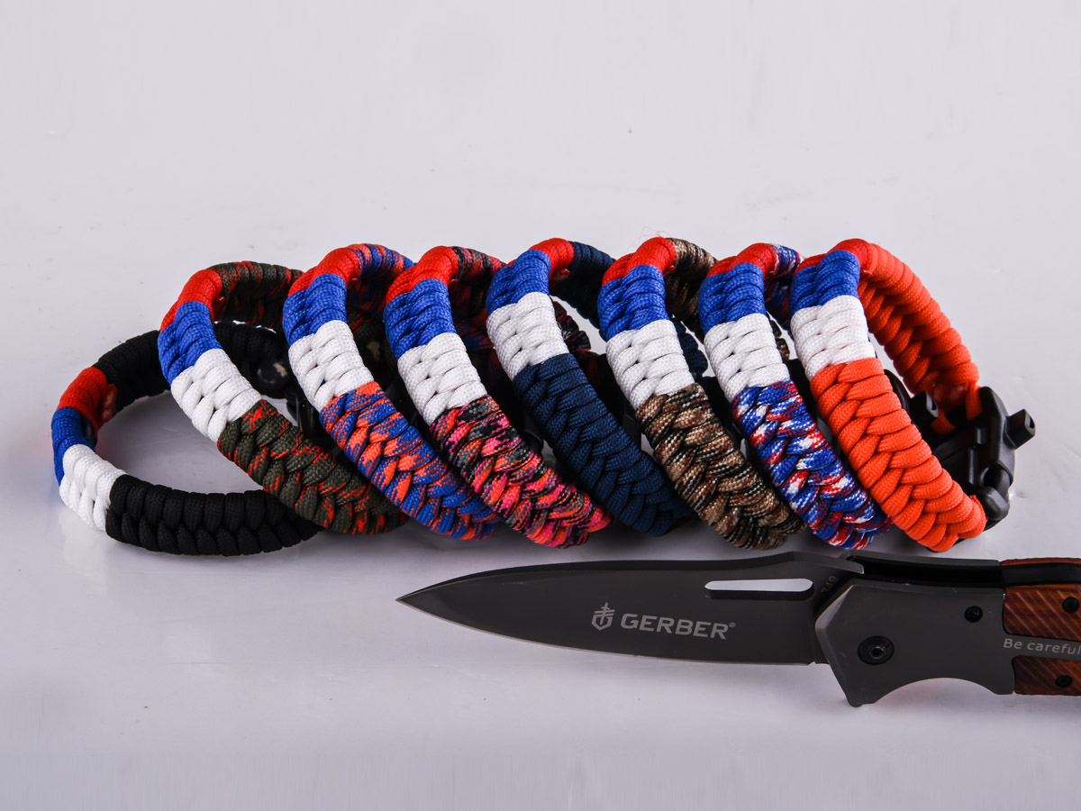 Плетеный браслет из паракорда по схеме рыбий хвост посередине с триколором застегивается с помощью черной пряжки. В пряжку встроен компас, свисток и надежное огниво.