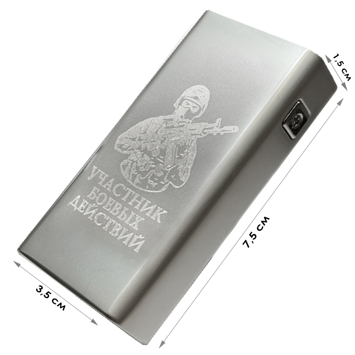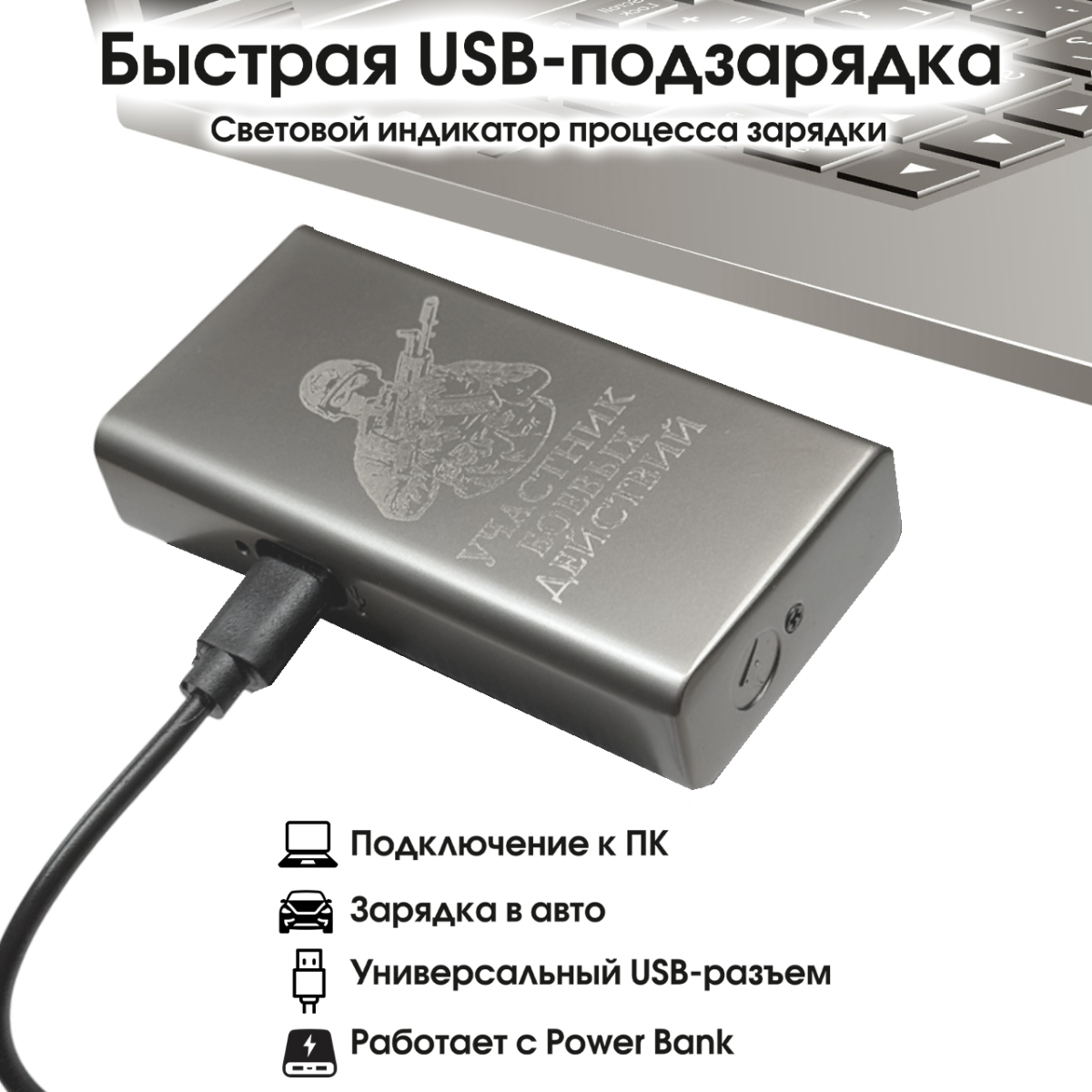 Подарочная USB-зажигалка "Участник боевых действий" — это не просто функциональный аксессуар, а также символ патриотизма и стиля. Модель оснащена встроенным аккумулятором, заряжается от любого USB-устройства и не требует заправки газом или бензином.