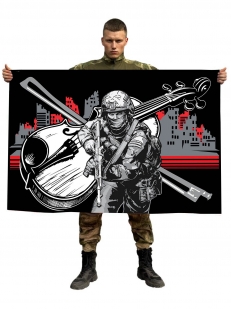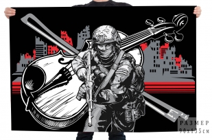Флаг выполнен с символикой ЧВК Вагнер, получившей широкую известность в современной военной среде. Графический образ бойца и скрещённые музыкальные инструменты отсылают к позывному "Вагнер" и идее силы и дисциплины. Такой дизайн подчёркивает атмосферу воинского братства, решительности и преданности своему делу.