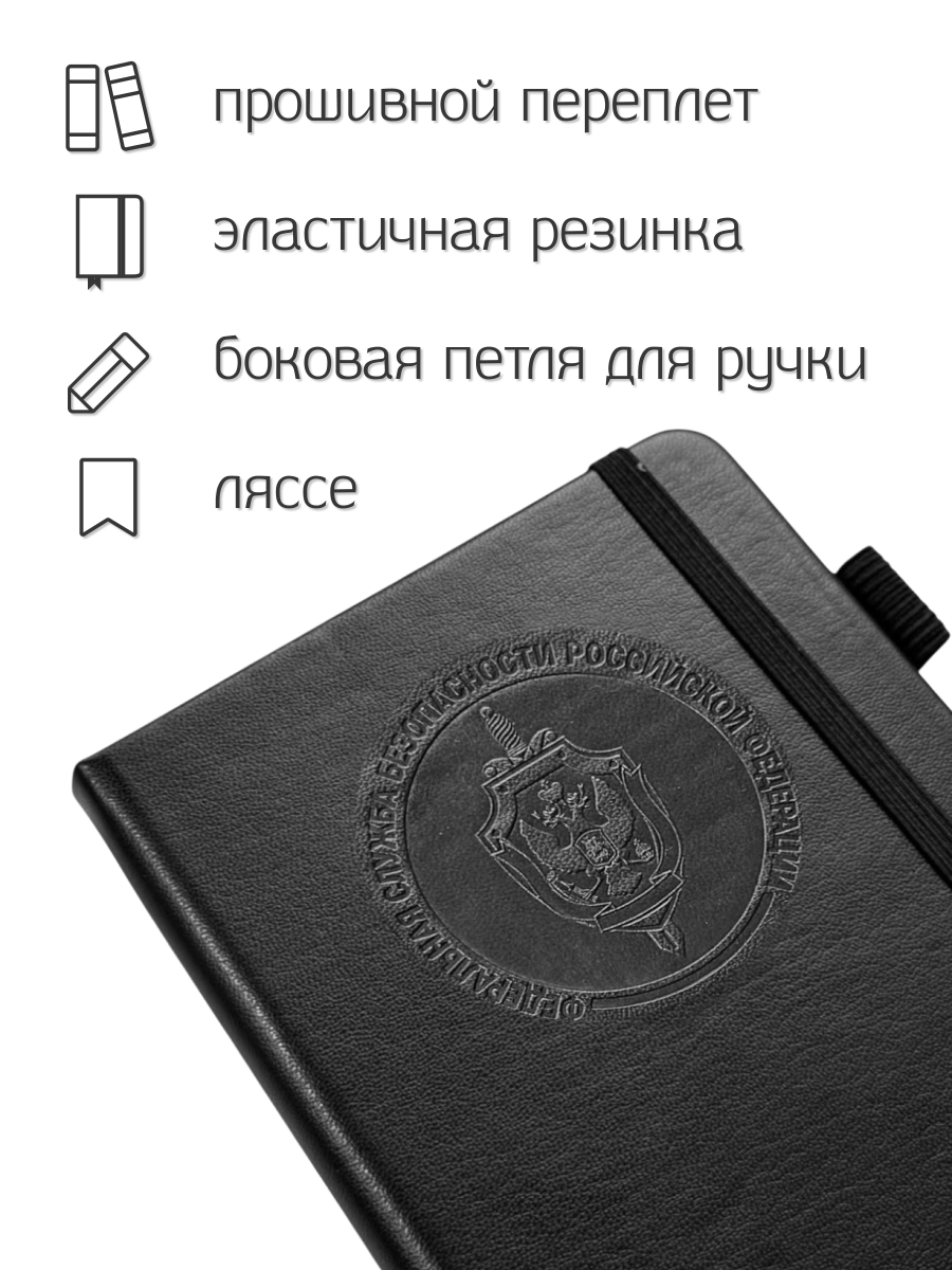 Компактный блокнот ФСБ в размере 11х14.5 см практичный и презентабельный для повседневных задач, помещается в карман. Обложка выполнена из приятной на ощупь эко-кожи с тиснением, защищает внутренний блок, и придаёт изделию солидный, аккуратный вид.