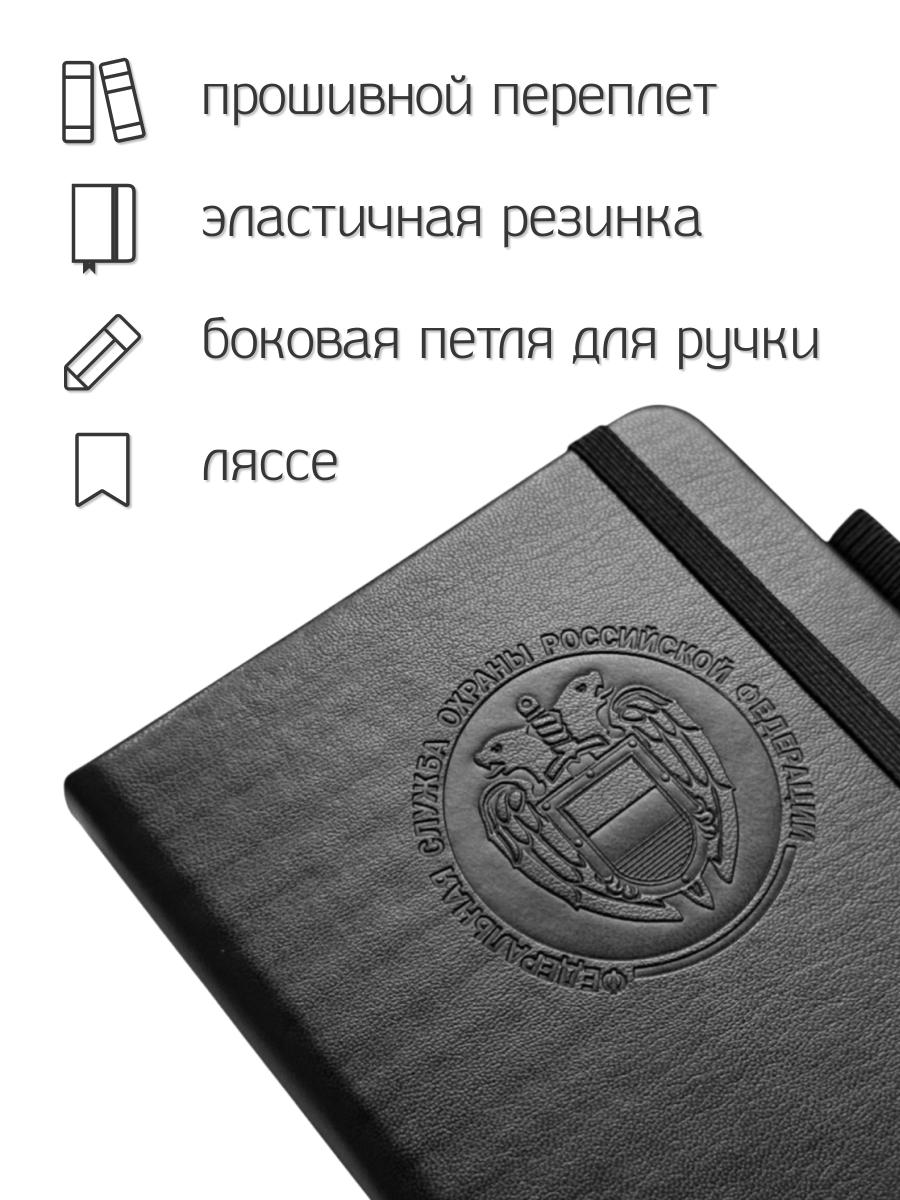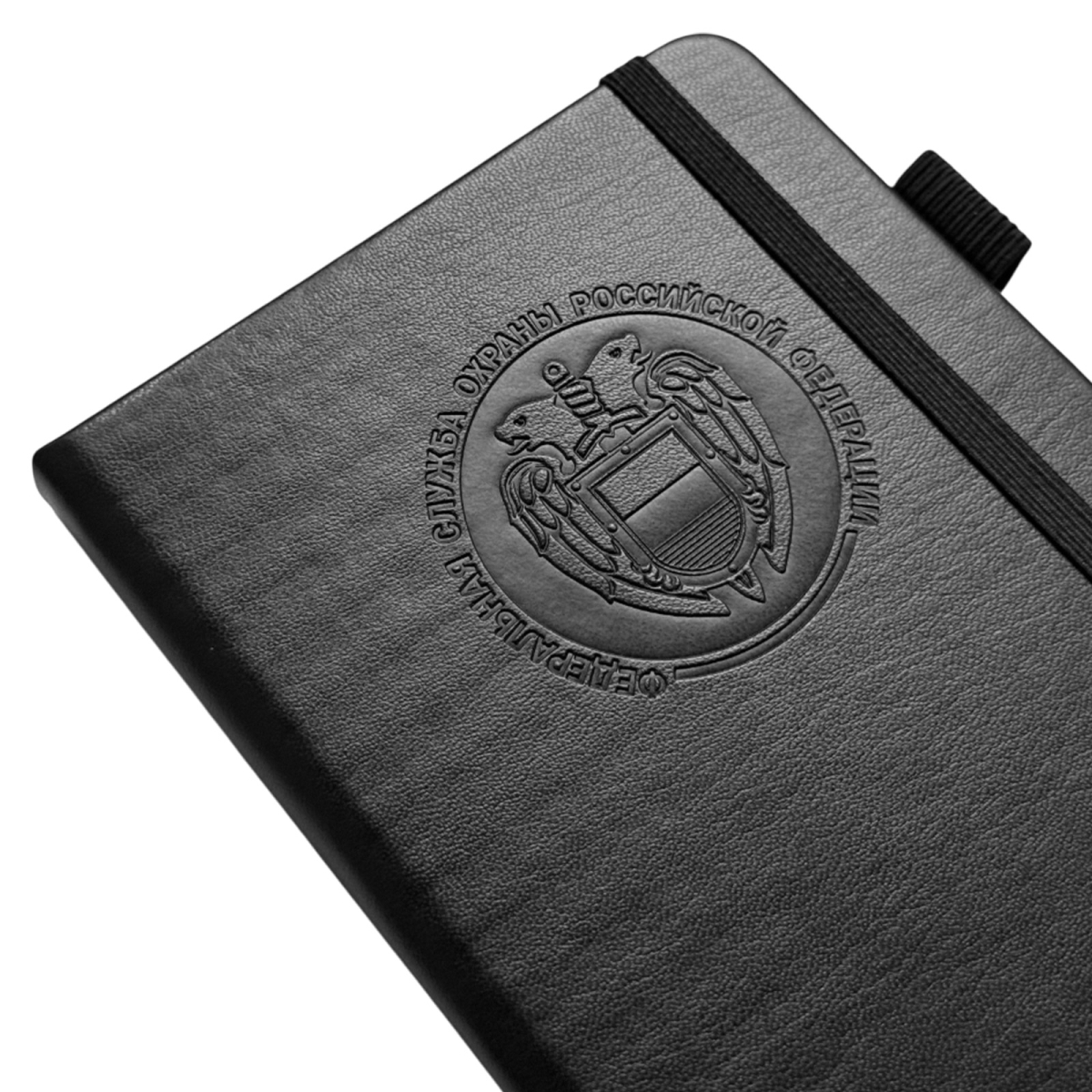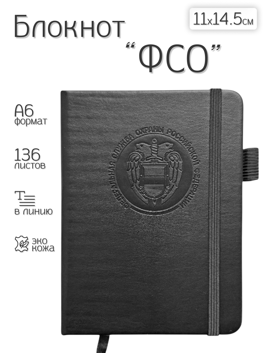 Компактный блокнот ФСО в размере 11х14.5 см практичный и презентабельный для повседневных задач, помещается в карман. Обложка выполнена из приятной на ощупь эко-кожи с тиснением, защищает внутренний блок, и придаёт изделию солидный, аккуратный вид.