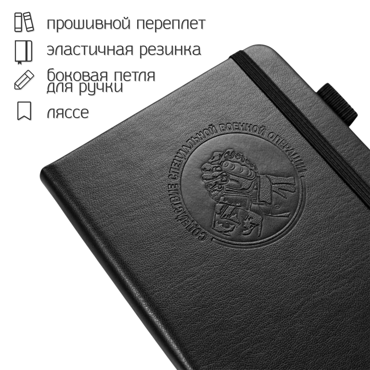 Карманный блокнот "Содействие СВО" из эко-кожи (11х14.5 см) – формат A6; в линию; обложка из ЭКО-кожи; прошивной переплёт; ляссе; эластичная петля для ручки №140