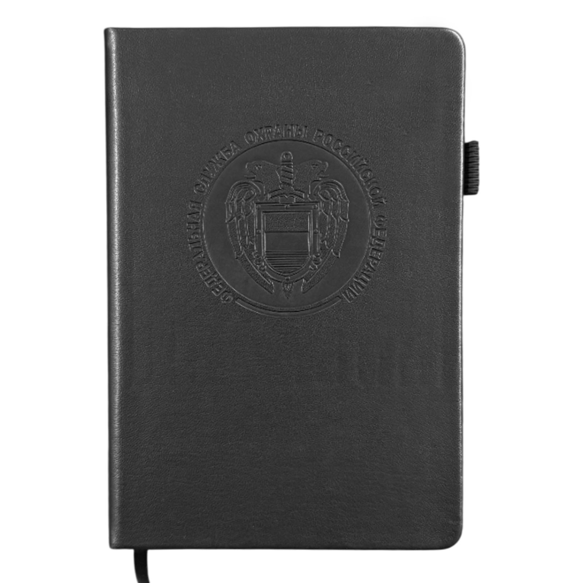 Черный блокнот ФСО в размере 13.5х19.5 см практичный и презентабельный для повседневных задач. Обложка выполнена из приятной на ощупь эко-кожи с тиснением, защищает внутренний блок, и придаёт изделию солидный, аккуратный вид.