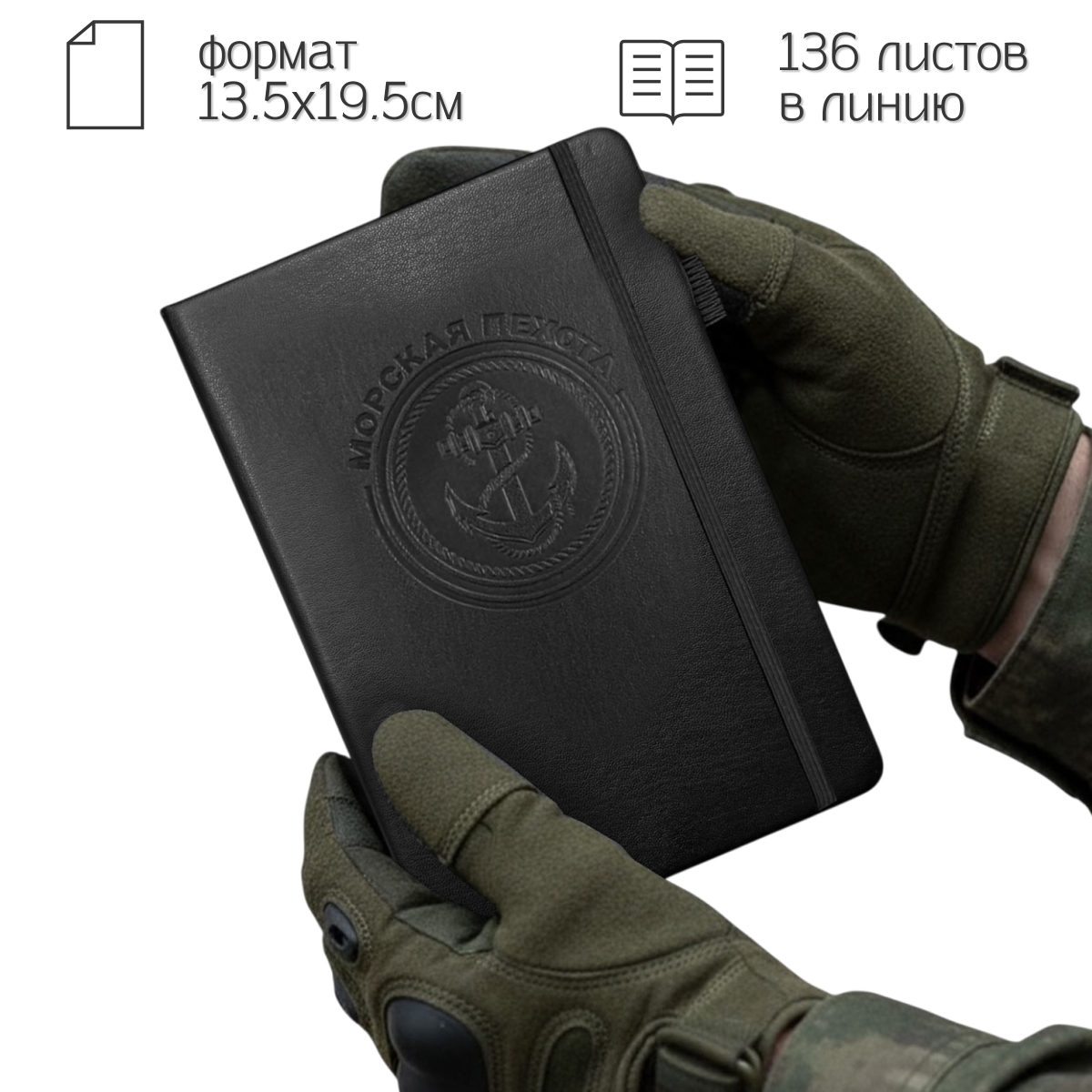 Черный блокнот "Морская пехота" в размере 13.5х19.5 см практичный и презентабельный для повседневных задач. Обложка выполнена из приятной на ощупь эко-кожи с тиснением, защищает внутренний блок, и придаёт изделию солидный, аккуратный вид.