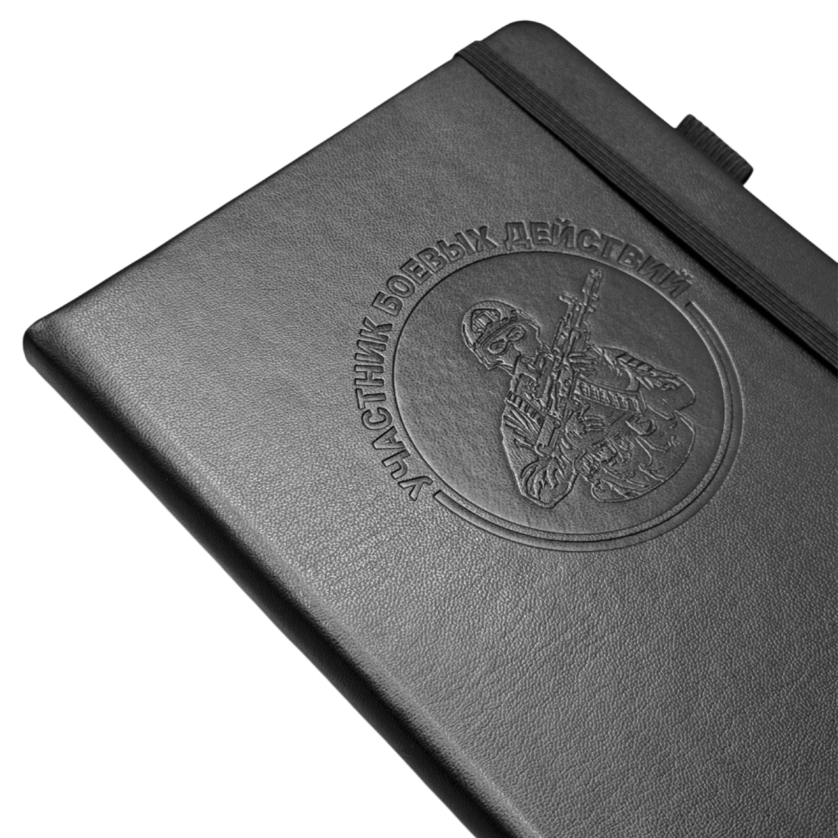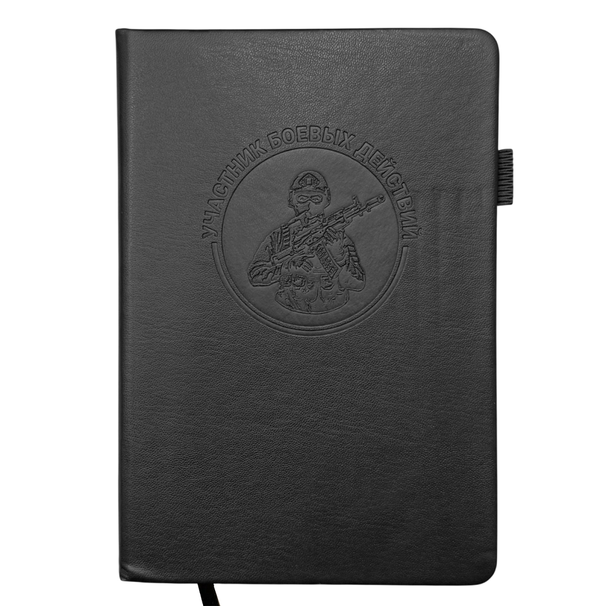 Черный блокнот "Участник боевых действий" в размере 13.5х19.5 см практичный и презентабельный для повседневных задач. Обложка выполнена из приятной на ощупь эко-кожи с тиснением, защищает внутренний блок, и придаёт изделию солидный, аккуратный вид.