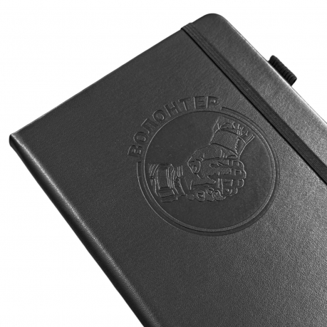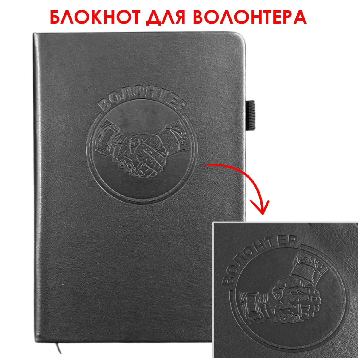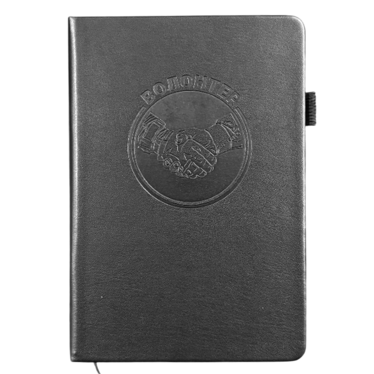 Черный блокнот "Волонтер" в размере 13.5х19.5 см практичный и презентабельный для повседневных задач. Обложка выполнена из приятной на ощупь эко-кожи с тиснением, защищает внутренний блок, и придаёт изделию солидный, аккуратный вид.