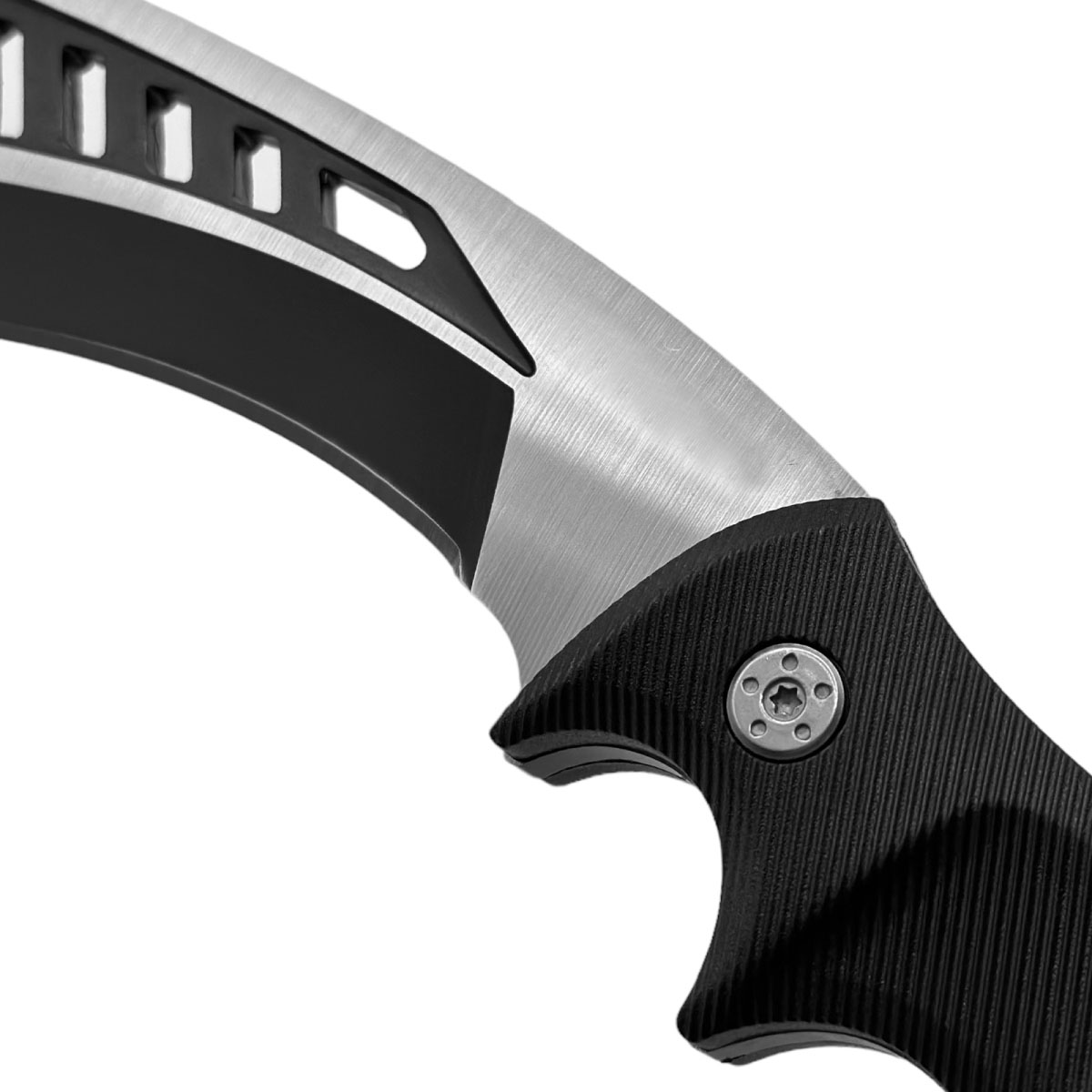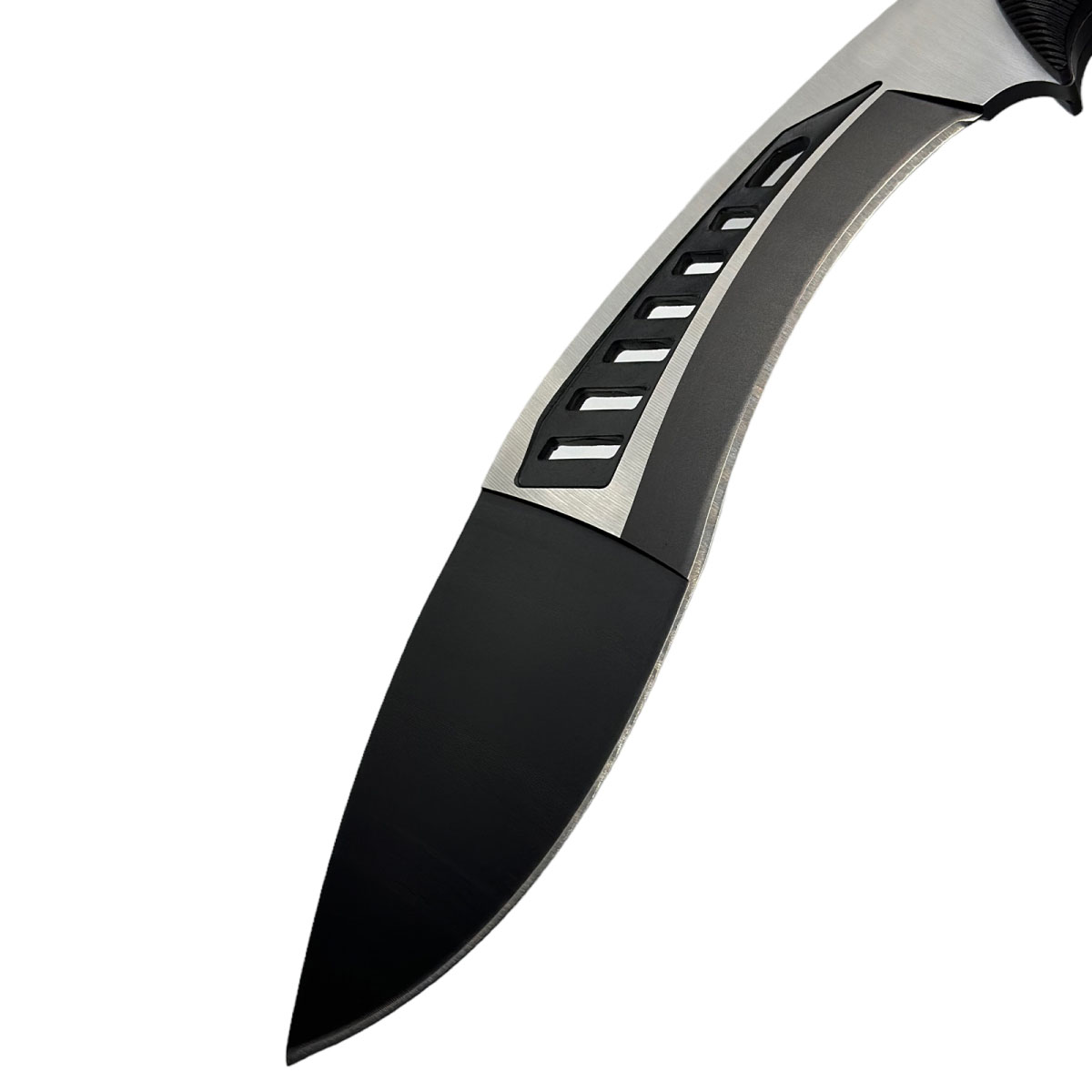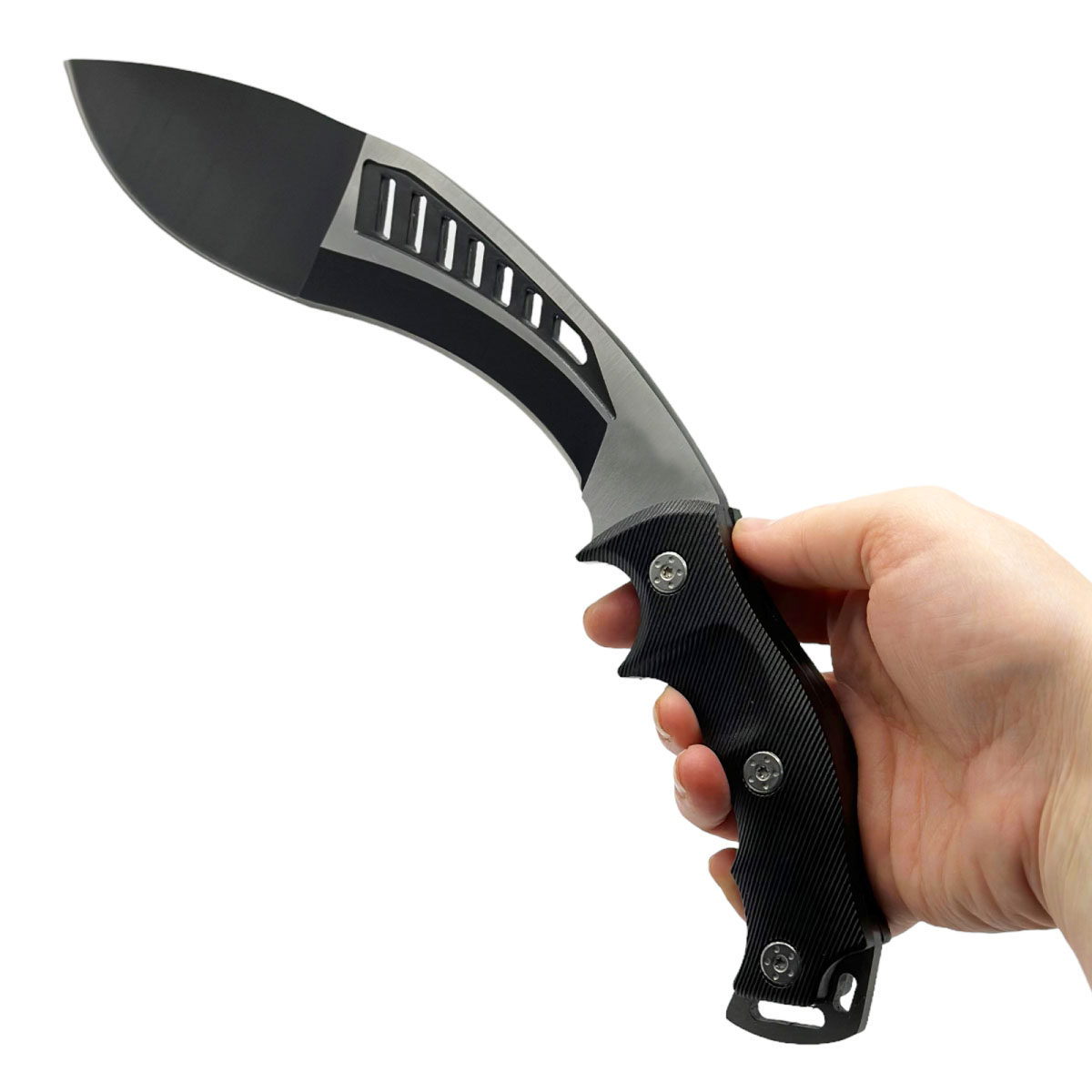 Нож выполнен из прочной высокоуглеродистой стали 420C, такая сталь длительное время держит заточку. Рукоятка изготовлена из рифлёного пластика. Форма рукоятки обеспечивает надежный хват.