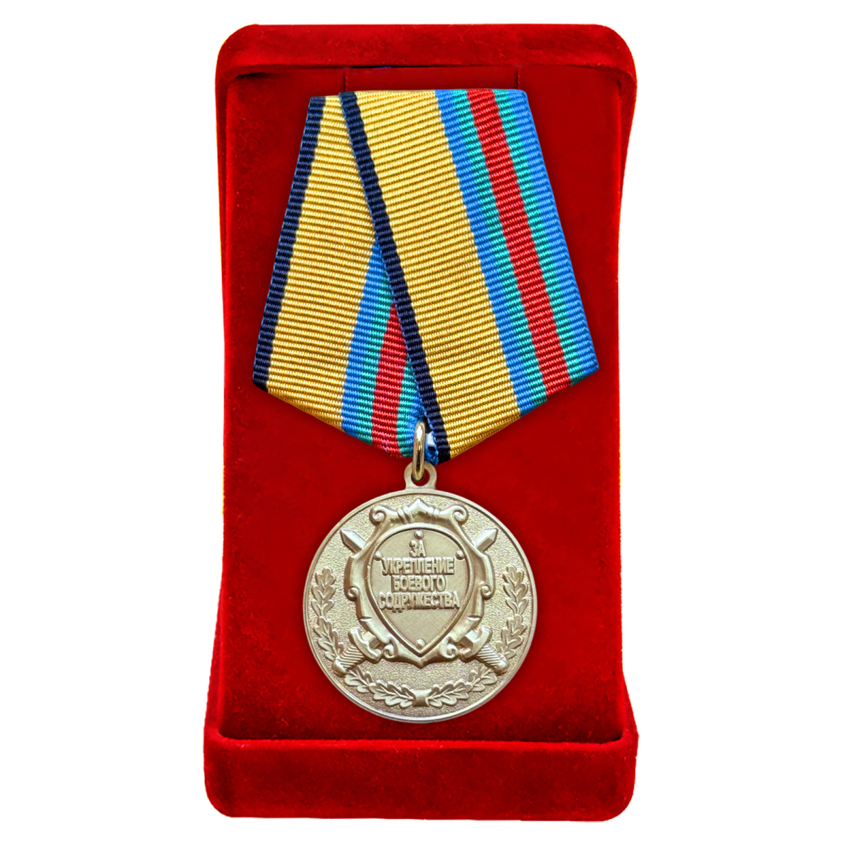 Медаль "За укрепление боевого содружества" МО в красивом бархатистом футляре, с удостоверением. Изготовлена из латуни с  покрытием холодная эмаль, пятиугольная колодка обтянута муаровой лентой, крепление - на булавочном зажиме. Учреждена 27.03.1995 года.