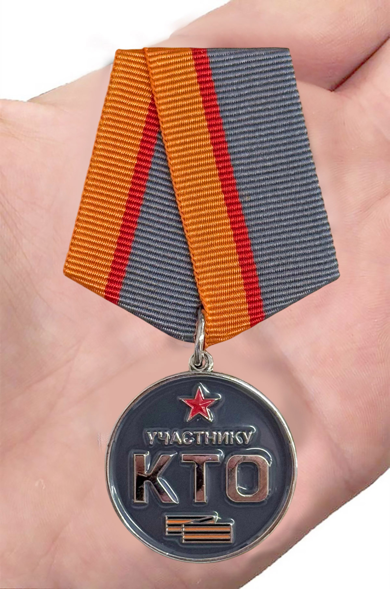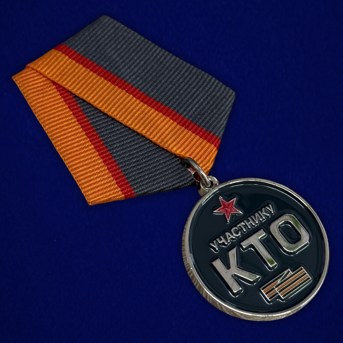 На аверсе размещена рельефная надпись «УЧАСТНИКУ КТО», дополненная символом звезды и Георгиевской лентой. Композиция выполнена сдержанно и строго, без излишних декоративных элементов.