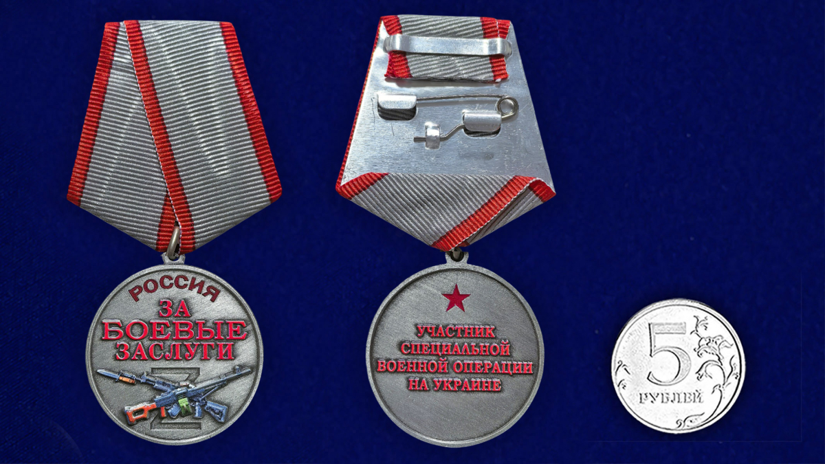 На аверсе медали размещена надпись "ЗА БОЕВЫЕ ЗАСЛУГИ", выполненная рельефным шрифтом с цветовой акцентировкой. В нижней части расположена композиция с изображением стрелкового оружия на фоне буквы Z. Оформление выдержано в строгом наградном стиле, подчёркивающем военную тематику и символику службы. На реверсе в центральной части размещена надпись "УЧАСТНИК СПЕЦИАЛЬНОЙ ВОЕННОЙ ОПЕРАЦИИ НА УКРАИНЕ", в верхней части – пятиконечная звезда. Композиция лаконична и выполнена без излишних декоративных элементов.