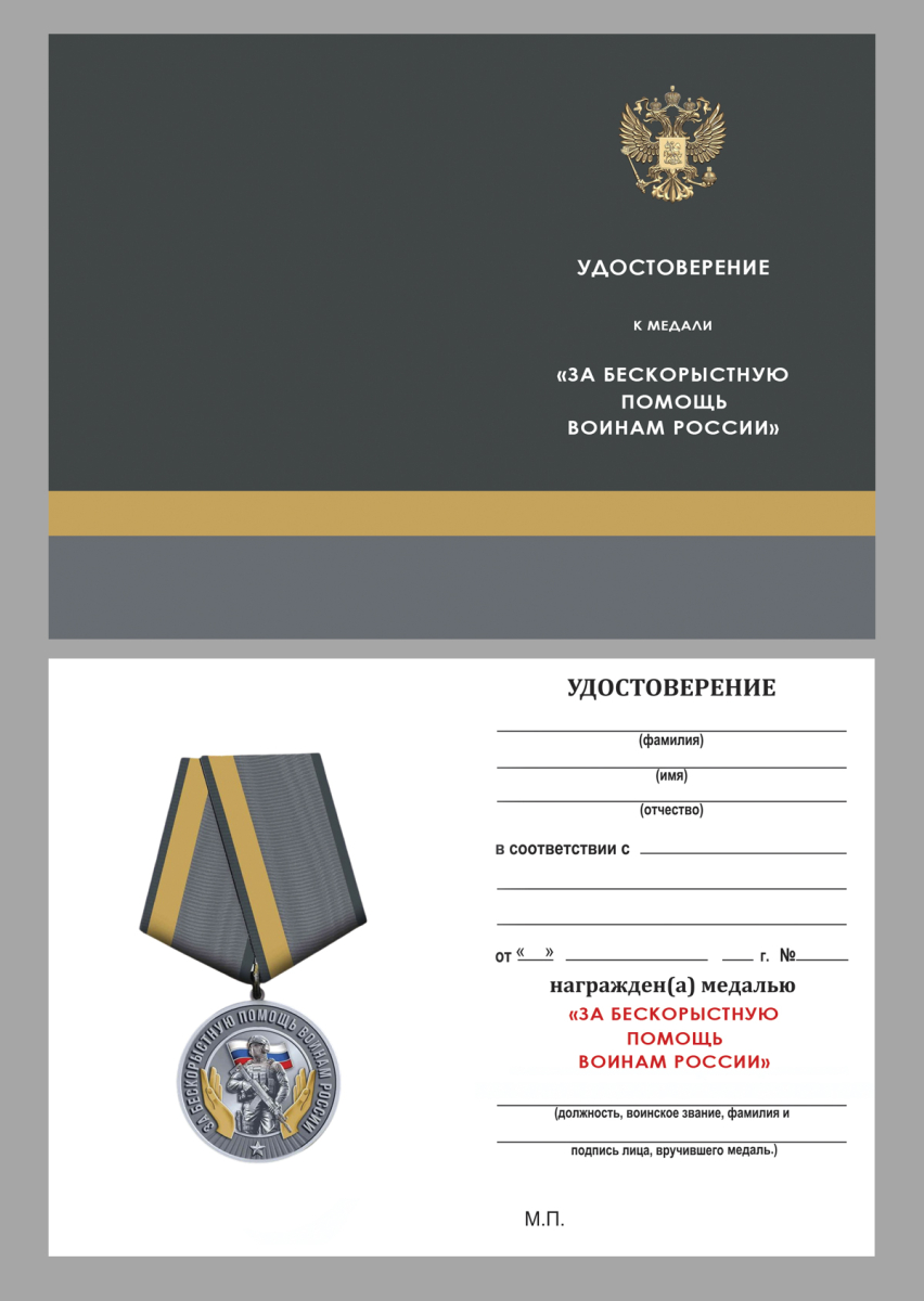 Медаль за бескорыстную помощь воинам России является памятным наградным знаком, символизирующим поддержку, участие и личный вклад. Подходит для вручения в знак благодарности, а также для коллекций и патриотических мероприятий.