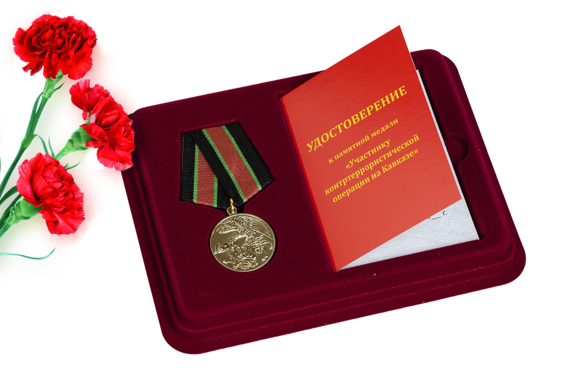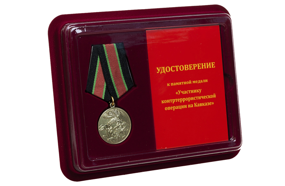 Медаль "За контртеррористическую операцию на Кавказе" в наградном футляре с ячейкой под удостоверение. Изготовлена из латуни с гальваническим покрытием, пятиугольная колодка обтянута муаровой лентой, крепится на булавочном зажиме.