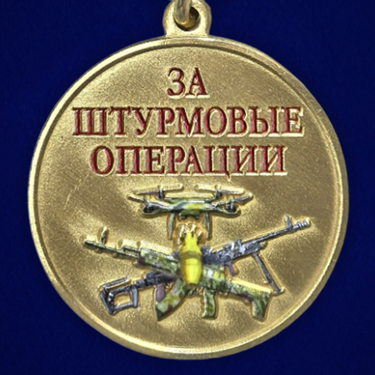 Медаль "За штурмовые операции" является памятной наградой, символизирующей участие в выполнении сложных боевых задач. Подходит для торжественного вручения и коллекционного хранения.