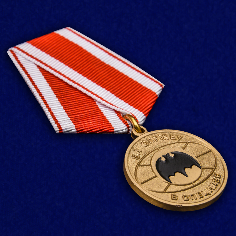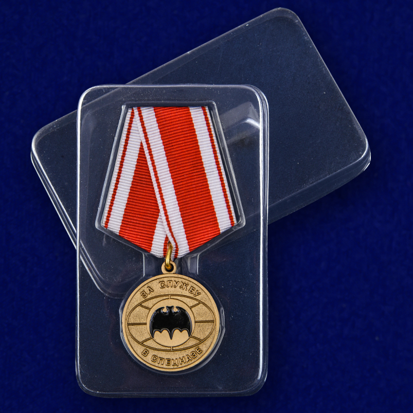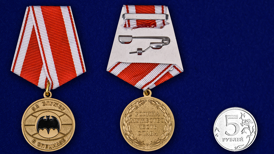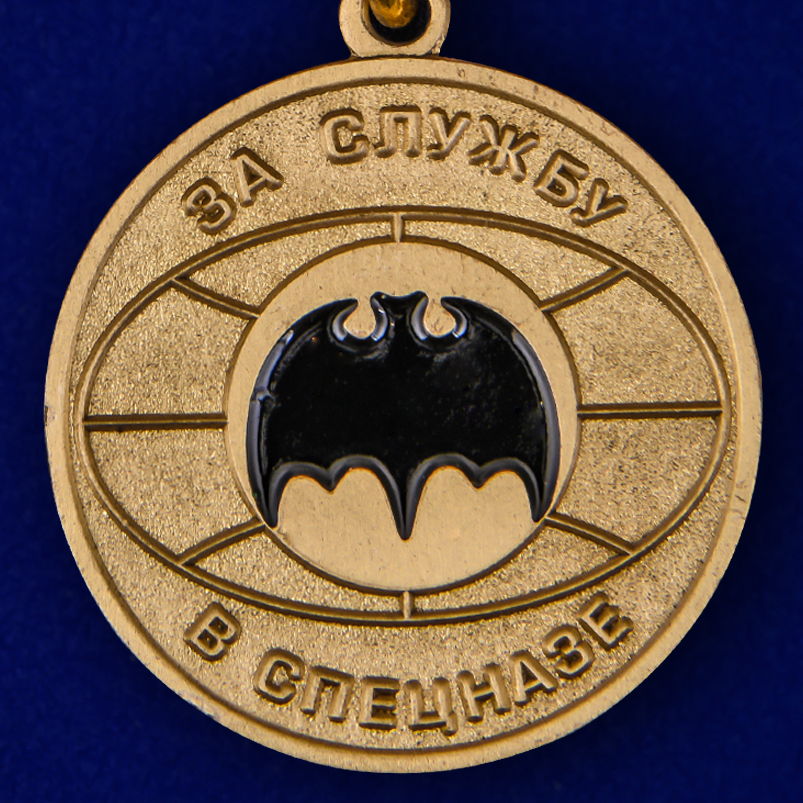 Медаль представляет собой круг золотистого цвета диаметром 32 мм. На аверсе медали помещена эмблема Военной разведки. По окружности медали, текст: "ЗА СЛУЖБУ В СПЕЦНАЗЕ".