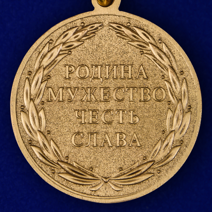 На реверсе медали по окружности размещен лавровый венок. В центре поля текст в четыре строки: "РОДИНА МУЖЕСТВО ЧЕСТЬ СЛАВА". Все надписи и изображения рельефные.