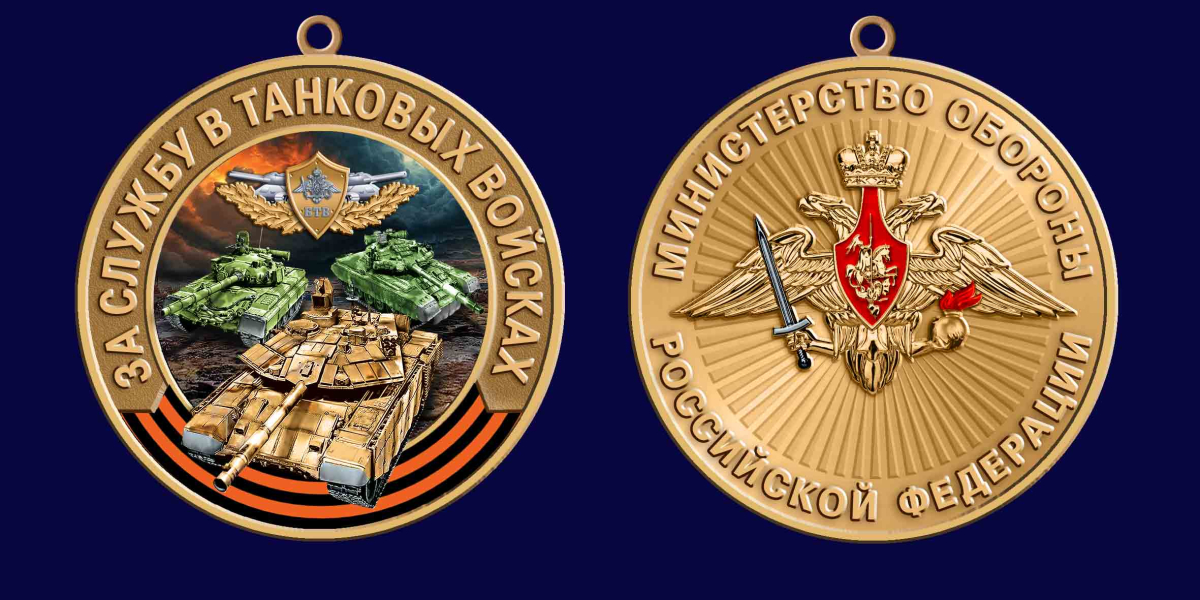 Аверс медали оформлен полноцветной композицией с изображением современной бронетехники. По окружности размещена рельефная надпись «ЗА СЛУЖБУ В ТАНКОВЫХ ВОЙСКАХ». Изображение выполнено с высокой степенью детализации, подчёркивая мощь бронетанковых подразделений и значимость службы в этом роде войск. На реверсе расположена рельефная эмблема Министерства обороны Российской Федерации с двуглавым орлом, мечом и щитом, а также круговая надпись «МИНИСТЕРСТВО ОБОРОНЫ РОССИЙСКОЙ ФЕДЕРАЦИИ». Композиция выдержана в строгом официальном стиле, рельеф чёткий и хорошо читаемый.