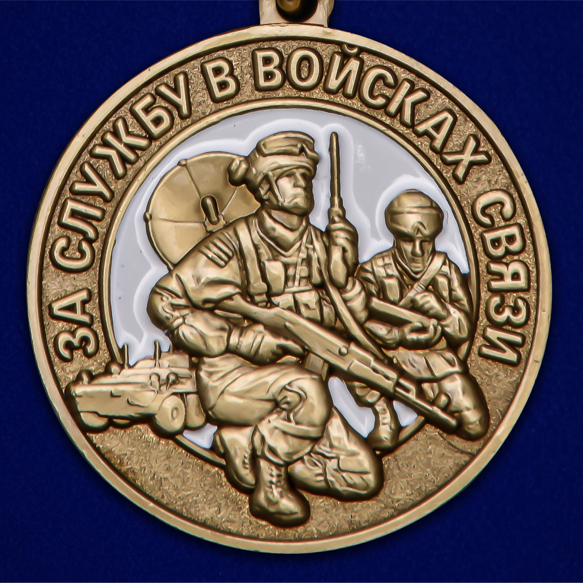 Медаль из латуни диаметром 32 мм с оригинальным аверсом содержит стилизованное изображение двух экипированных военных связистов. В верхней части полукругом у бортика размещена надпись; "ЗА СЛУЖБУ В ВОЙСКАХ СВЯЗИ".