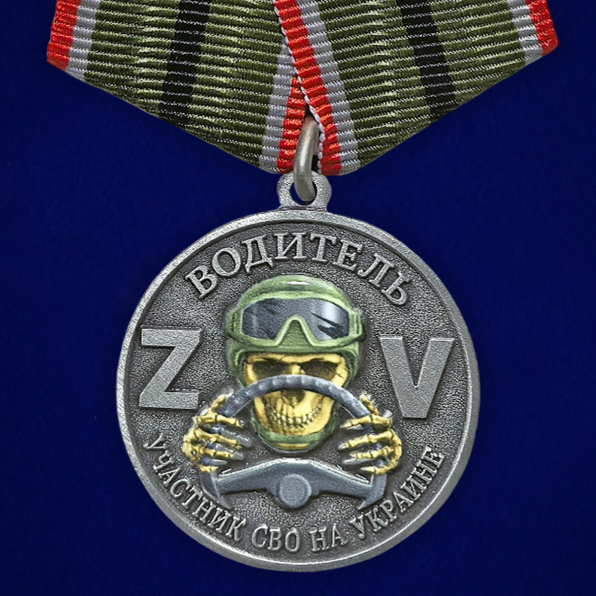 На аверсе медали размещена надпись "ВОДИТЕЛЬ" и "УЧАСТНИК СВО НА УКРАИНЕ". В центральной части представлена рельефная композиция с изображением водителя за рулём на фоне символов "Z" и "V". Детальная проработка элементов подчёркивает специфику службы и принадлежность к участникам специальной военной операции. На реверсе размещена надпись "ЗА СЛУЖБУ", ниже расположена композиция с изображением военного автотранспорта на фоне городского пейзажа. Оформление выдержано в строгом наградном стиле.