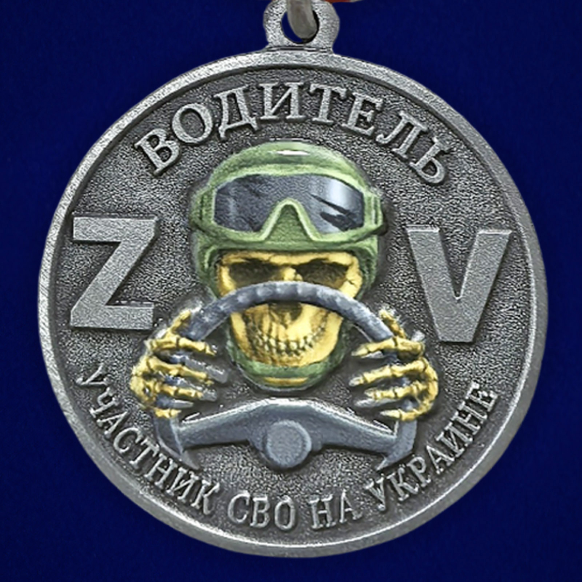 На аверсе медали размещена надпись "ВОДИТЕЛЬ" и "УЧАСТНИК СВО НА УКРАИНЕ". В центральной части представлена рельефная композиция с изображением водителя за рулём на фоне символов "Z" и "V". Детальная проработка элементов подчёркивает специфику службы и принадлежность к участникам специальной военной операции. На реверсе размещена надпись "ЗА СЛУЖБУ", ниже расположена композиция с изображением военного автотранспорта на фоне городского пейзажа. Оформление выдержано в строгом наградном стиле.