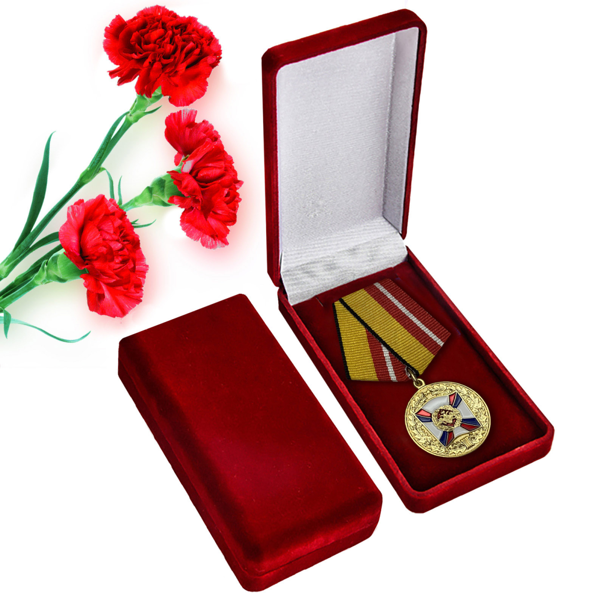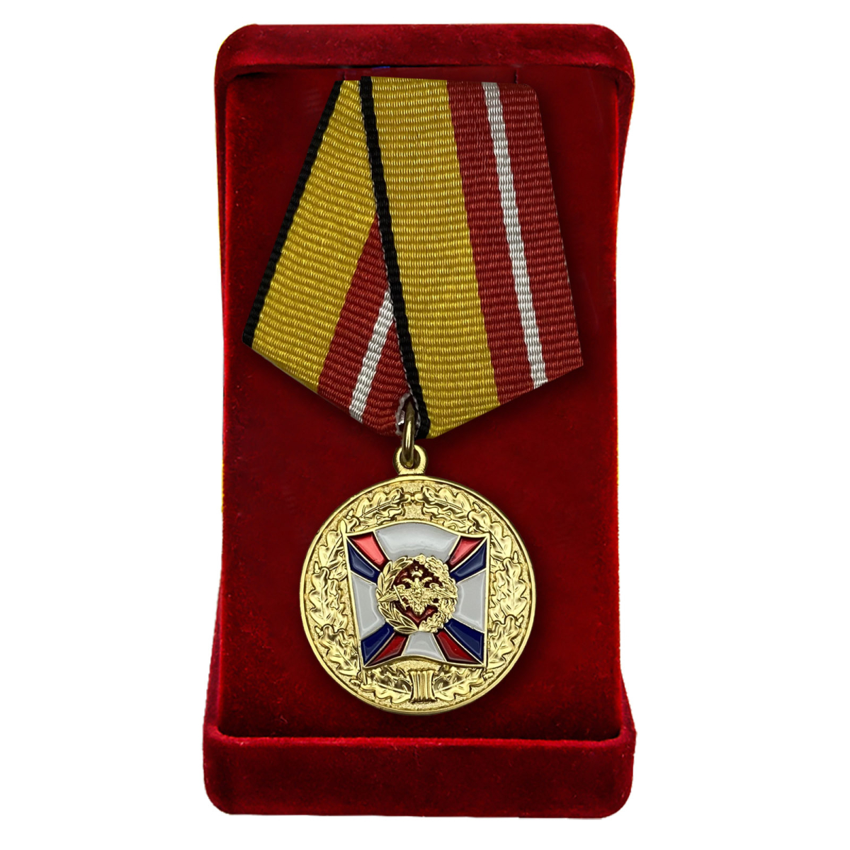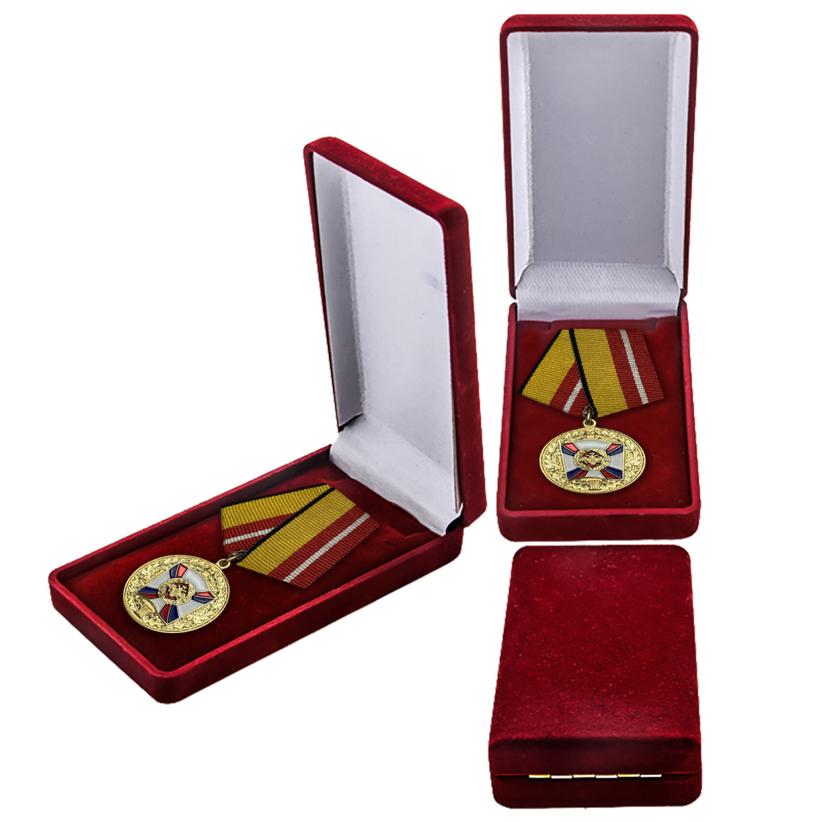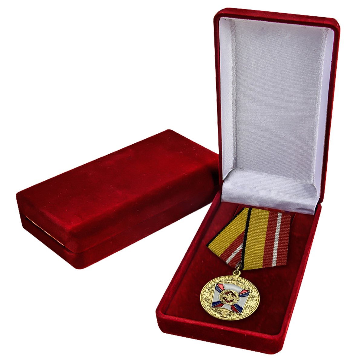 Медаль «За воинскую доблесть» 1 степени в презентабельном футляре бордового цвета, с удостоверением. Изготовлена из латуни с гальваническим и эмалевым покрытием, пятиугольная колодка обтянута муаровой лентой, крепится к одежде на булавочном зажиме.