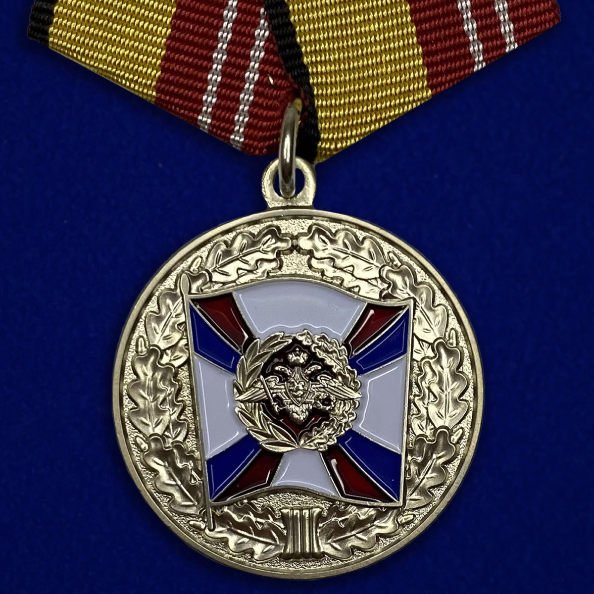 Медаль "За воинскую доблесть" 3 степени Министерства Обороны РФ в наградном бархатистом футляре, с удостоверением. Изготовлена из латуни, покрытие - гальваника и цветная эмаль, колодка - пятиугольная, обтянута муаровой лентой, крепится к одежде на булавочном зажиме.