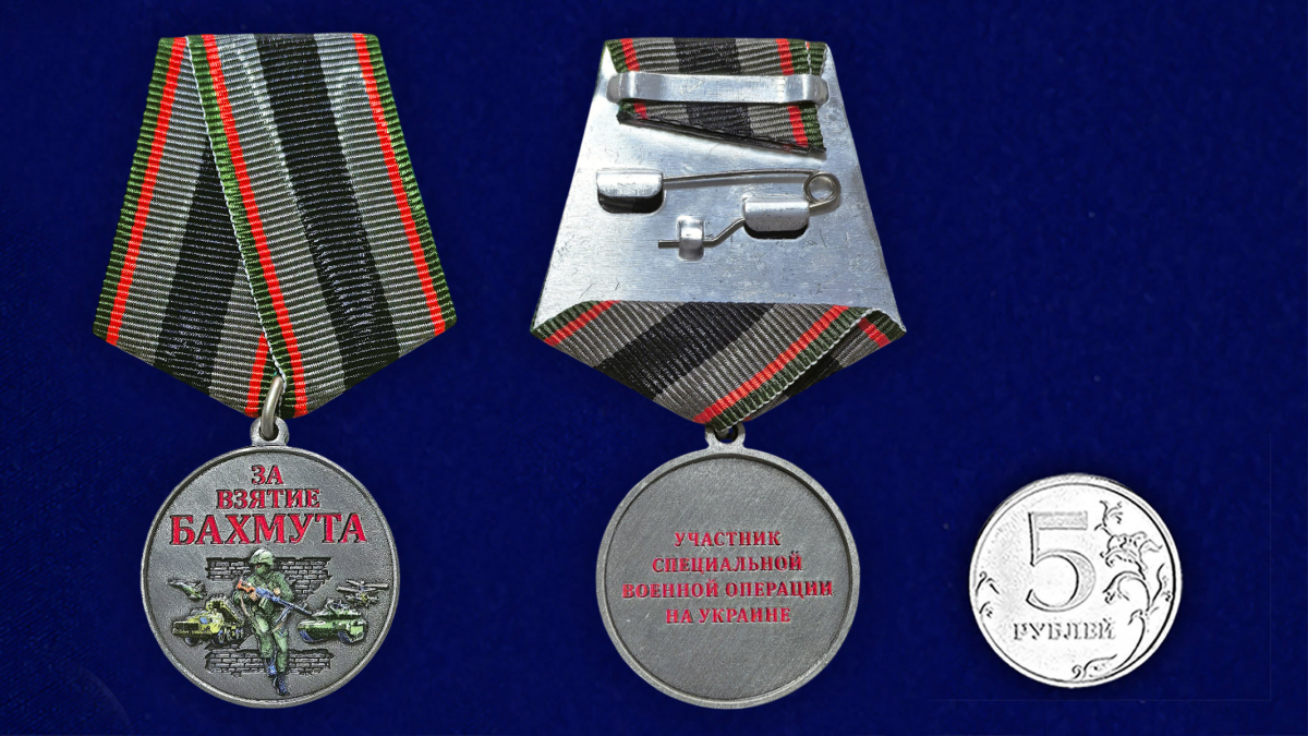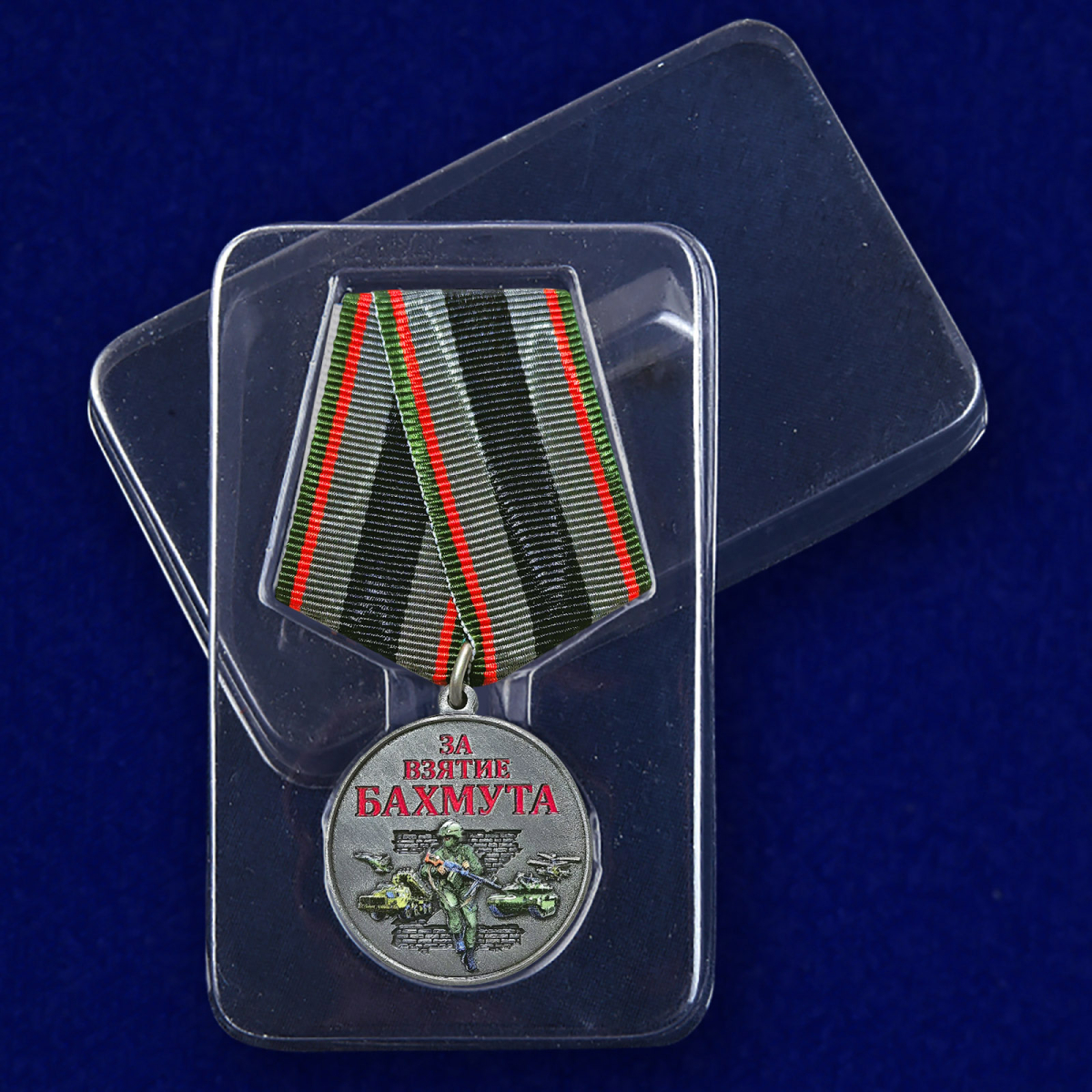 Медаль "За взятие Бахмута" является памятной наградой, символизирующей участие в выполнении боевых задач. Подходит для торжественного вручения и коллекционного хранения.