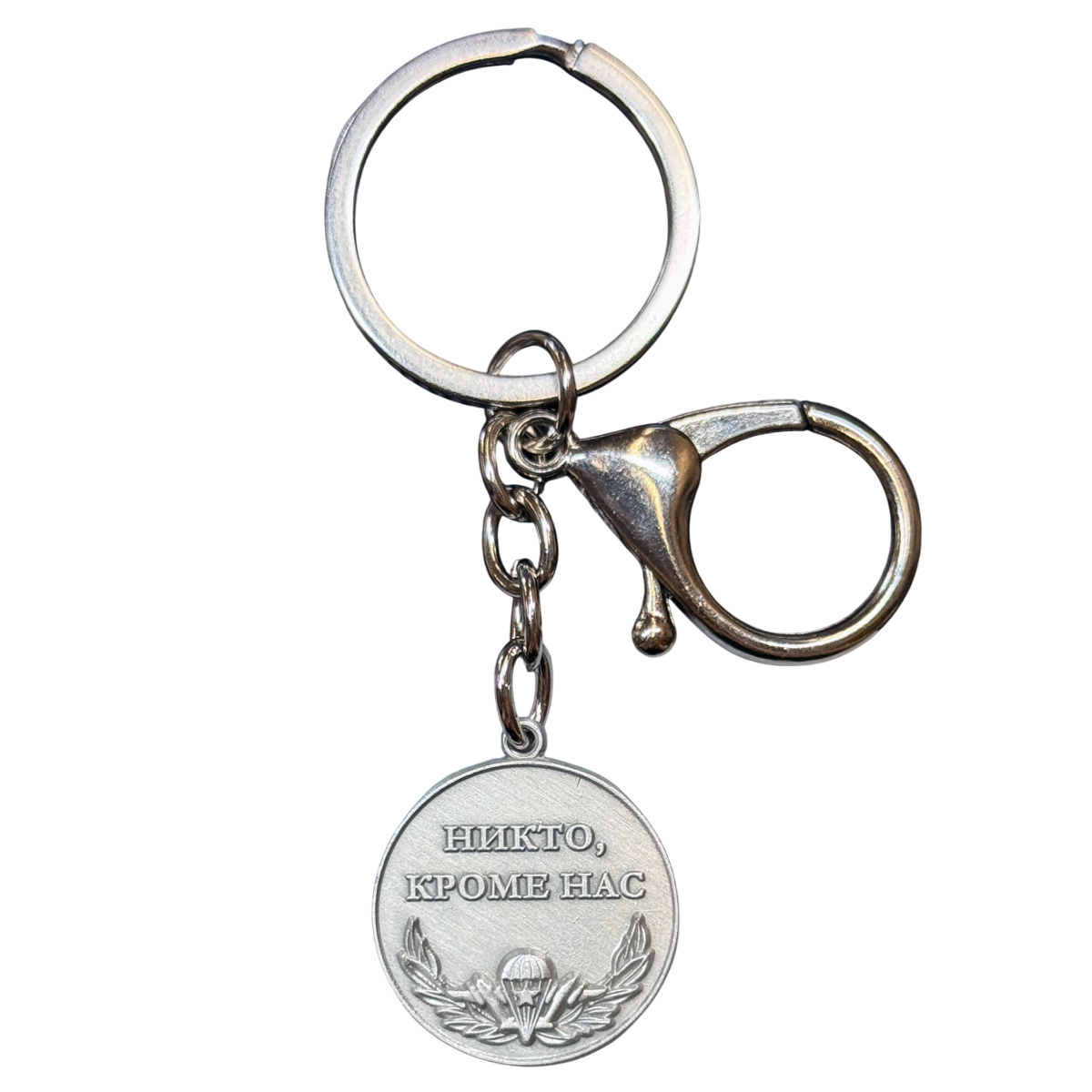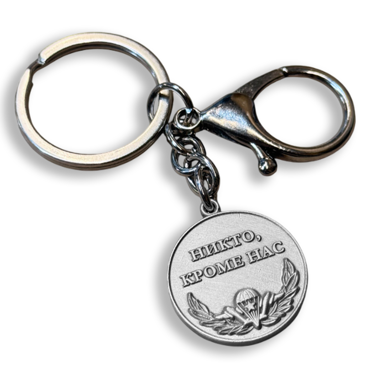 Металлический брелок-медаль ВДВ с девизом "Никто, кроме нас"