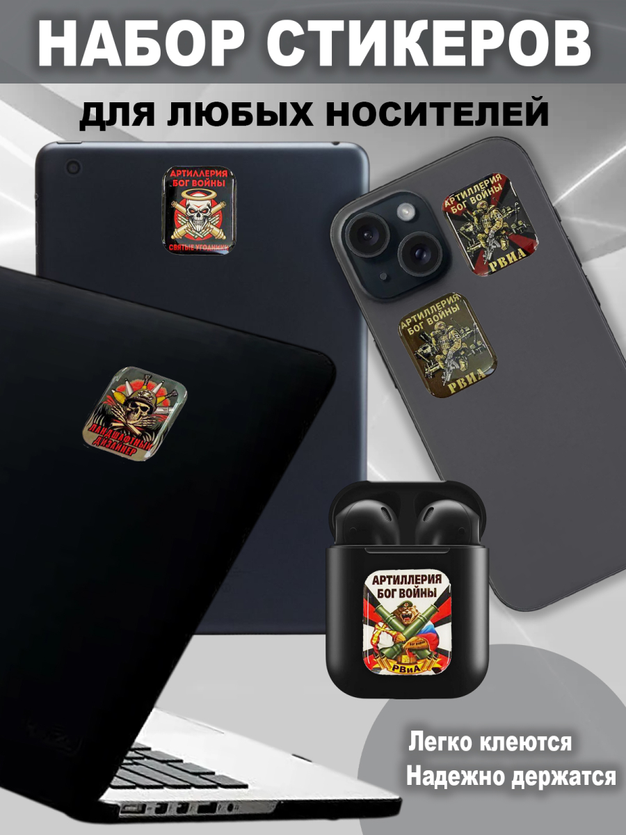 Универсальный набор ярких стикеров  с символикой РВиА — отличное решение для украшения личных вещей и создания индивидуального стиля. Каждый стикер покрыт прозрачным верхним слоем из полиуретановой смолы, что придаёт изображению эффект объёма, защищает от влаги, выцветания и механических повреждений. Стикеры легко клеятся на телефон, ноутбук, планшет, блокнот или любую гладкую поверхность, держатся прочно и не теряют яркости со временем.