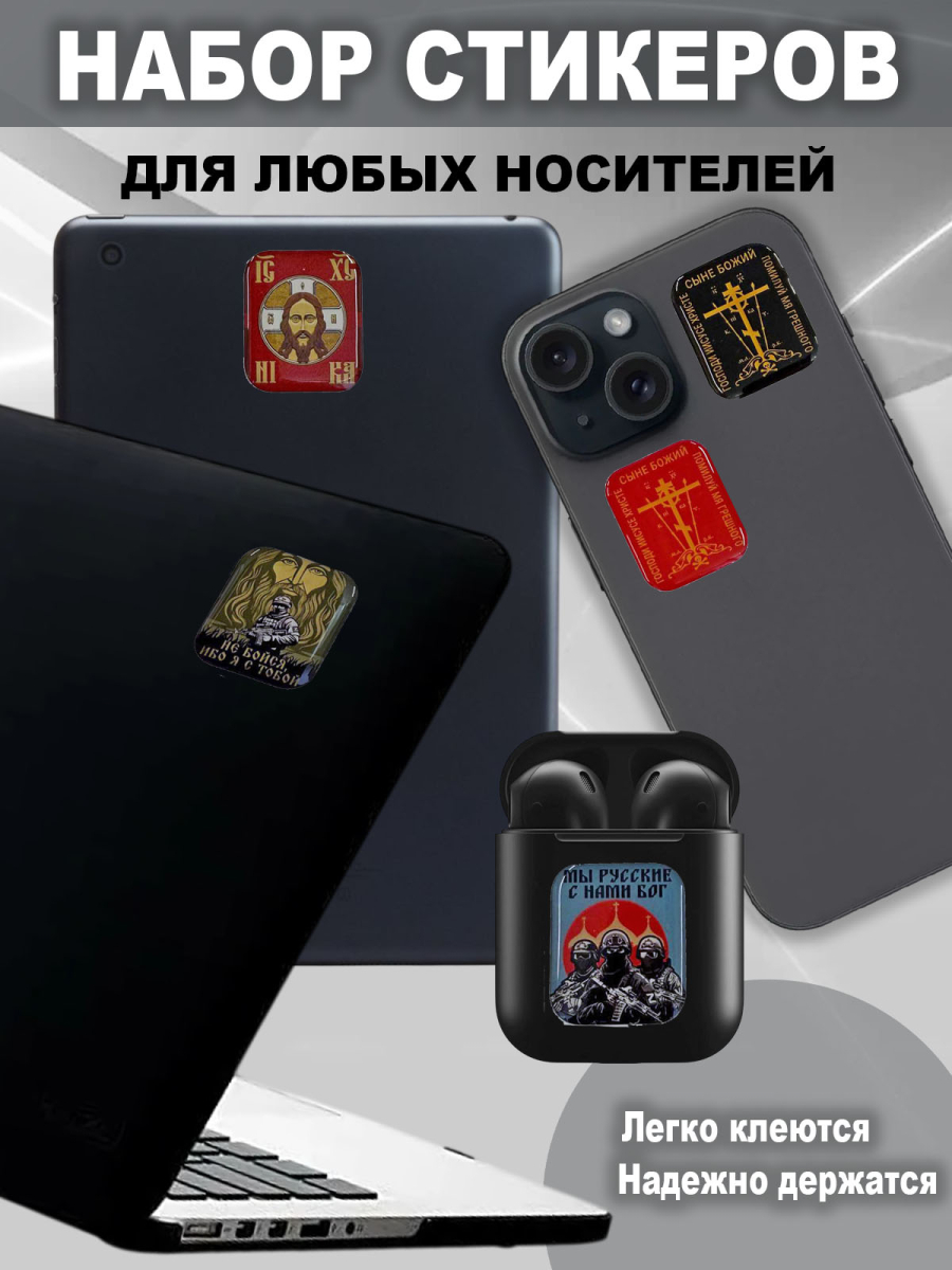 Универсальный набор ярких стикеров  "Мы русские, с нами Бог" — отличное решение для украшения личных вещей и создания индивидуального стиля. Каждый стикер покрыт прозрачным верхним слоем из полиуретановой смолы, что придаёт изображению эффект объёма, защищает от влаги, выцветания и механических повреждений. Стикеры легко клеятся на телефон, ноутбук, планшет, блокнот или любую гладкую поверхность, держатся прочно и не теряют яркости со временем.